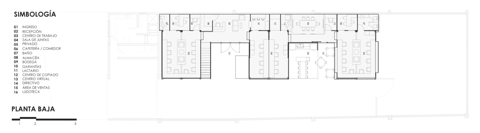 در طبقه همکف، شش کانتینر حمل و نقل ۲۰ فوتی به عنوان پایه استفاده شده که فضاهای ۶×۵ متری را ایجاد کرده است که اندازه مناسبی برای مناطق اداری است. اینها با راهروهای اصلی به هم پیوسته بودند و سه ماژول متناسب با نیازهای خاص شرکت را تشکیل می دادند که دارای مناطق عملیاتی، فروش، بازاریابی، تدارکات، اتاق جلسات، حمام، پذیرایی، اتاق بازی، کافه تریا و دفاتر مستقل برای مدیران و مدیر عامل بودند.