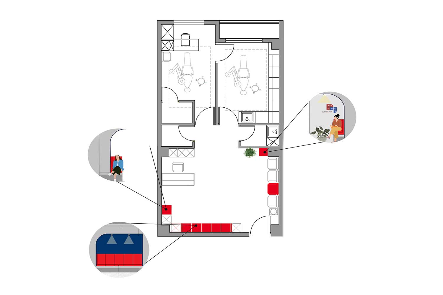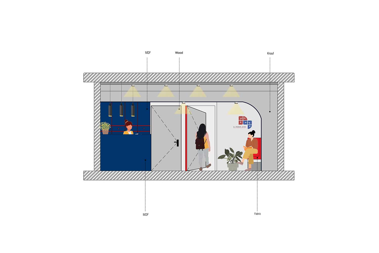 فضای نشیمن به سه قسمت تقسیم شده است. دو قسمت برای بازدیدکنندگان و یک قسمت برای پذیرایی و میز پذیرایی. با توجه به فرم و مبلمان اولیه، یک پوسته فرم کاربردی که شامل ستون‌ ها و ستون و در فضای نشیمن به همراه چند صندلی تکی در فضا طراحی شده است که به کاربران حق انتخاب برای نشستن در فضای مجزا را می‌ دهد.