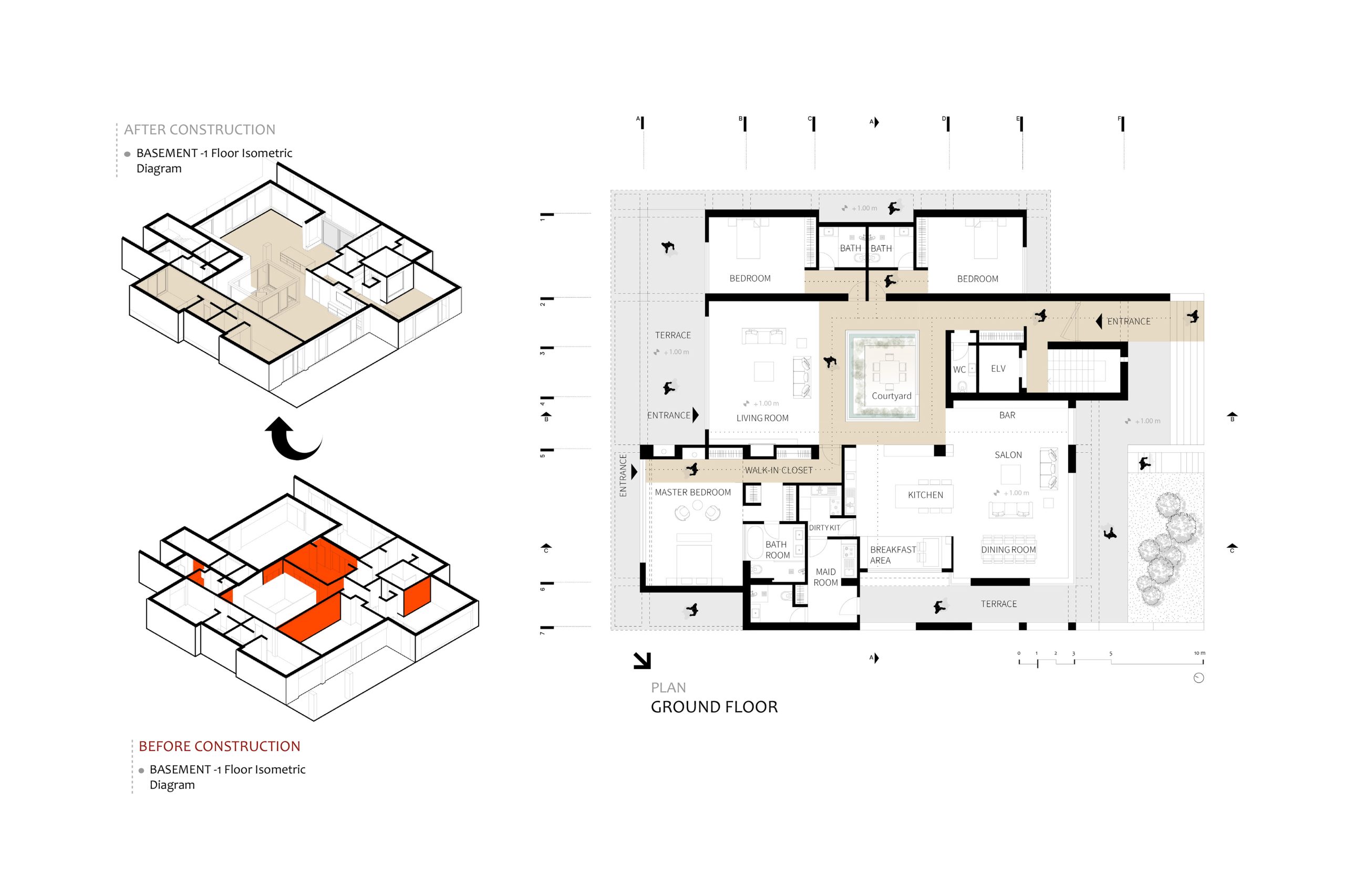 در  ادامه سعی بر آن شده تا  ظرفیت های موجود در بنا که بازشوها و جداره های وسیع شیشه ای بود را  تقویت کنند و تا جای ممکن به حذف زوائد پرداخته شود. در نتیجه تمامی دیوارهای میانی تا جای ممکن حذف شدند. همچنین برای تعریف فضایی همیشه سبز ، با تغییر کاربری پاسیو وسط خانه به حیاط مرکزی که محل آساییدن در کنار آب نما و گیاهان همیشه سبز با سقفی از  آسمان است پاسخ داده شده است. پس نورگیر به حیاط مرکزی تبدیل شده که همانند  قلب خانه و جعبه تقسیم، فضاها از آن منشعب شده ، از سبزینگی آن جان تازه می گیرند  و ساختار کلی معماری خانه را شکل می دهند.
