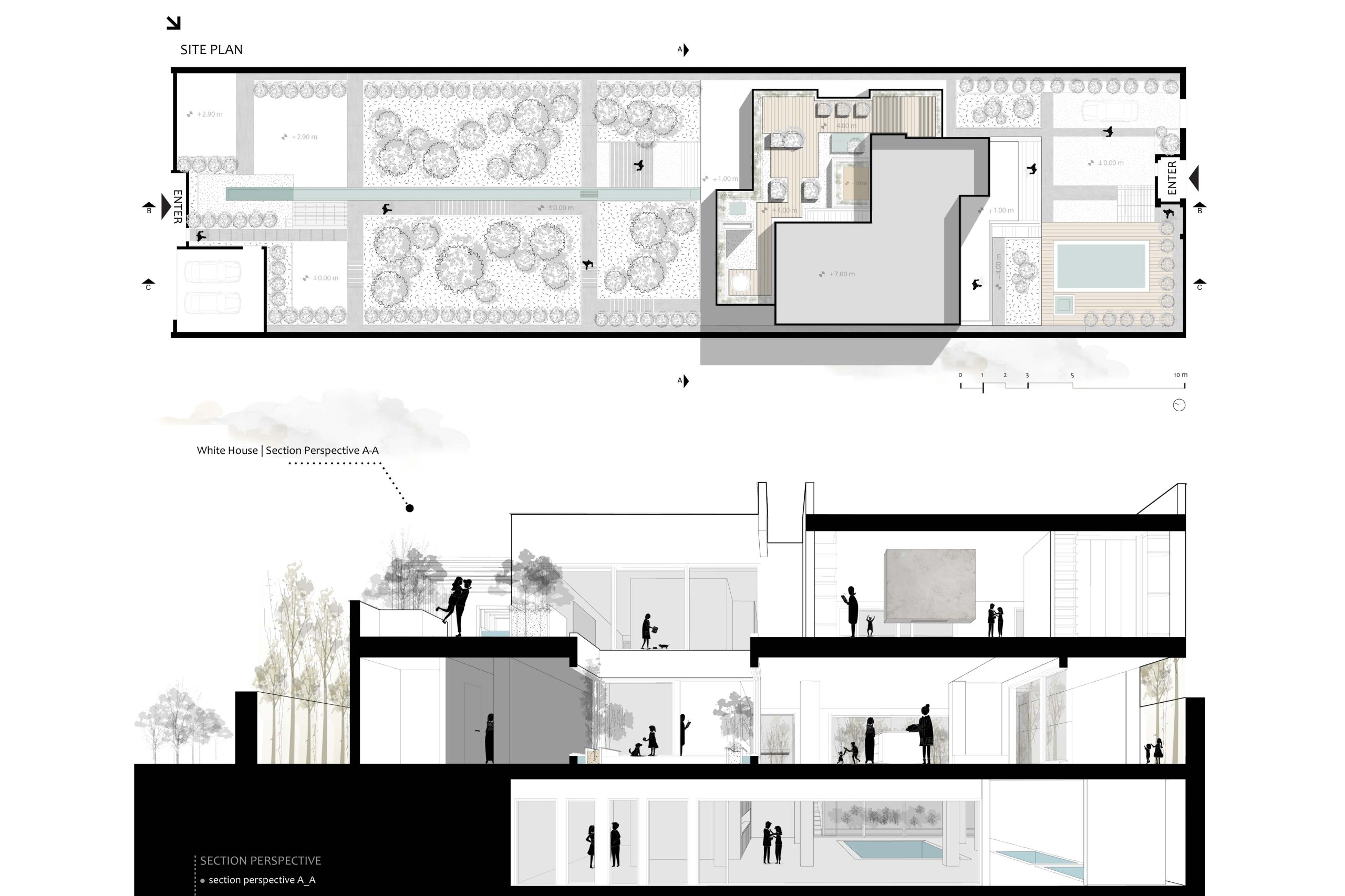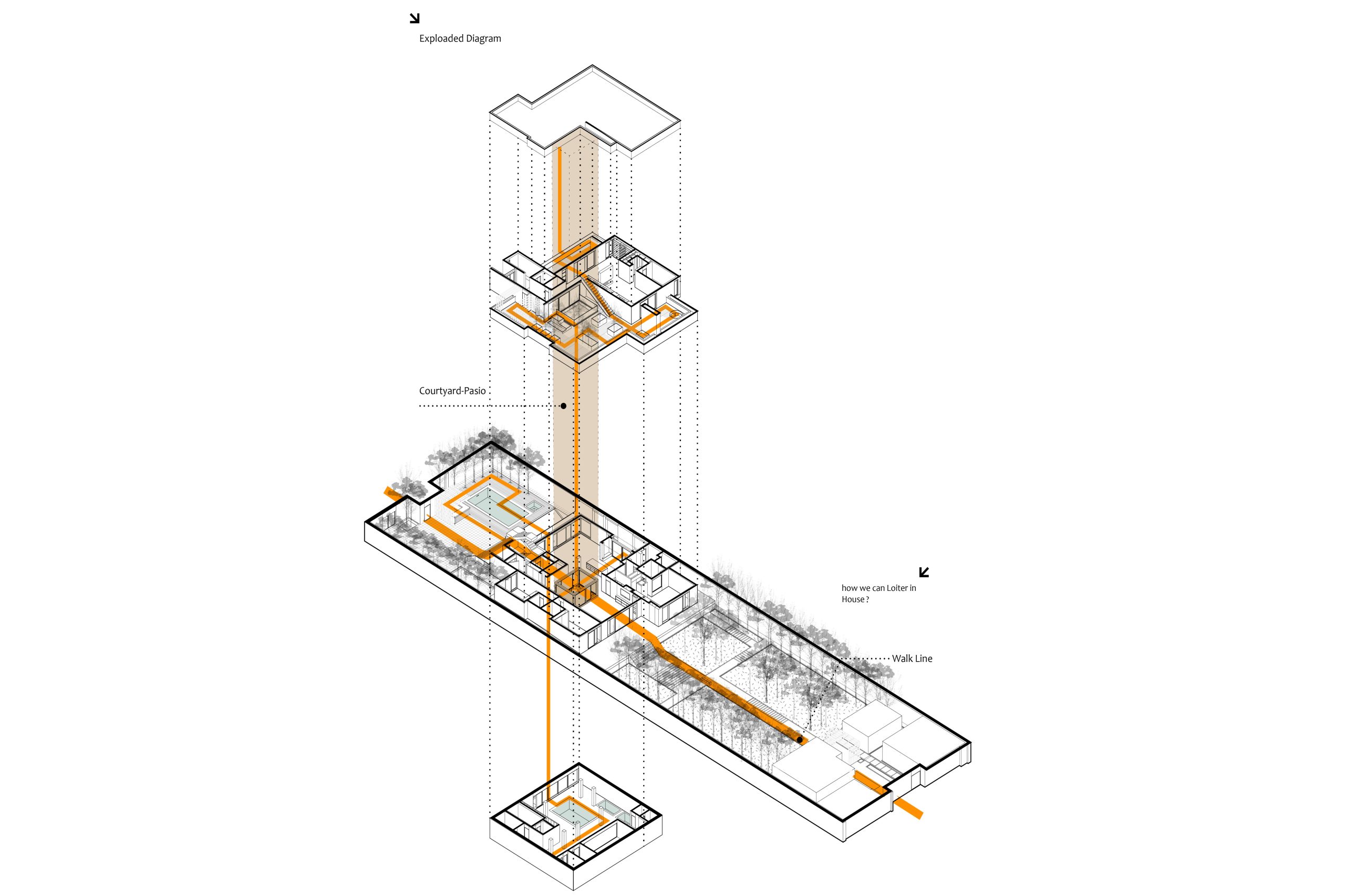 مسئله اصلی در طراحی این پروژه، پاسخ به نیاز تیپولوژی جدید خانه های مسکونی در تقابل با تیپولوژی معمول و عرف مسکونی بود. لذا تیپ معمول تغییر داده شده است، کنشی میان کاربر و پروژه ایجاد کرده و پروژه را براساس پرومناد شکل داده اند. پلان ها را از حالت روتین و معمول خود خارج کرده و به باز تعریف تیپولوژی معمول خانه های مسکونی پرداخته شده است. حذف مرزها شده و در جریان پرومناد از دید ناظر، سکانس های مختلفی را بصورت لایه بندی تعریف کرده اند و به این ترتیب کیفیاتی جدید از فضاهای موجود در یک خانه را به کاربر ارائه داده اند. بنیان ساختاری خانه مبتنی بر سکانس های  تعریف شده و لایه بندی های فضایی مجاور هم بر اساس شبکه منظمی شکل گرفت. در این پرومناد، مخاطب به عنوان مهم ترین مؤلفه در ادراک فضا در میان سکانس ها حرکت می کند، تجربه می کند و  فضاها را به هم پیوند می دهد.
