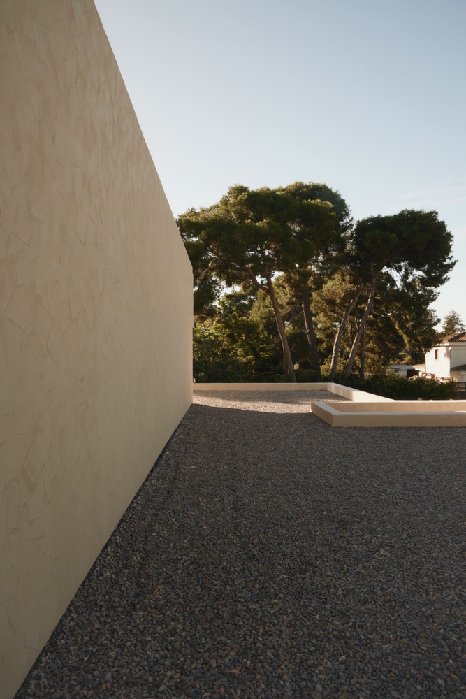 این خانه به طور استراتژیک به گونه ای طراحی شده است که نور روز را در فضاهای اصلی زندگی – اتاق نشیمن، اتاق غذاخوری، آشپزخانه و باغ – به حداکثر برساند و فضاهای باز و درخشانی را ایجاد کند که به سمت بیرون امتداد مییابند. در مقابل، چهار سوئیت در یک منطقه خصوصی تر و خلوت تر قرار گرفته اند که برای تضمین آرامش و صمیمیت طراحی شده است. پنجره های بزرگی که در سراسر خانه امتداد دارند، مرزهای بین داخل و خارج را از بین می برند و به نور مدیترانه ای اجازه می دهند آزادانه وارد شود و هر فضا را قادر می سازد تا مستقیماً به سمت باغ نفس بکشد. این گشودگی با یک نمای خاکی و بافتدار تکمیل میشود که روکش گرم و ناهموار آن، مادیت معماری را برجسته می کند و هر کنسول را به یک ژست مجسمه گونه در گفتگو با چشم انداز والنسیا تبدیل می کند.