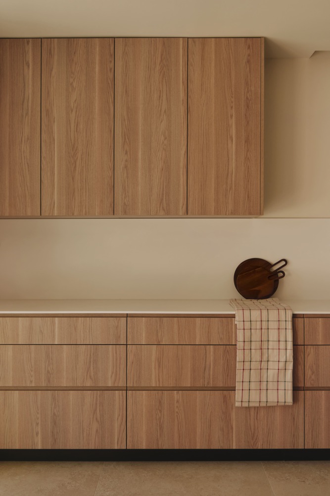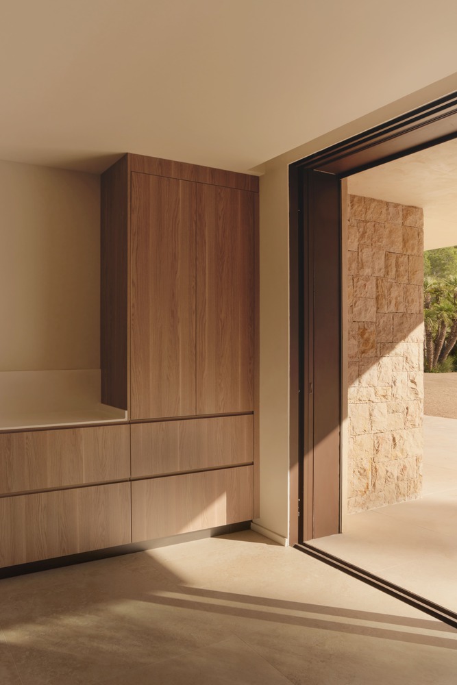 در داخل، این اقامتگاه فضاهایی سخاوتمندانه، گرم و آرام را ارائه می دهد که برای رفاه در نظر گرفته شدهاند. انتخاب مصالح – چوبهای روشن، سطوح پیوسته و رنگ های ملایم – حس آرامشی را تقویت می کند که مکمل هندسه قوی بیرونی ساختمان است. در پشت بام ها، ۷۰ متر مربع تراس، گوشه های دنجی را برای لذت بردن از آب و هوای مدیترانه ای فراهم می کند، در حالی که باغ، که در اطراف یک استخر وسیع سازماندهی شده است، به قلب اجتماعی خانه تبدیل می شود. با دسترسی مستقیم از آشپزخانه و اتاق نشیمن، این فضای باز به طور طبیعی میزبان زندگی خانوادگی و تعامل روزانه با فضای بیرونی است.
