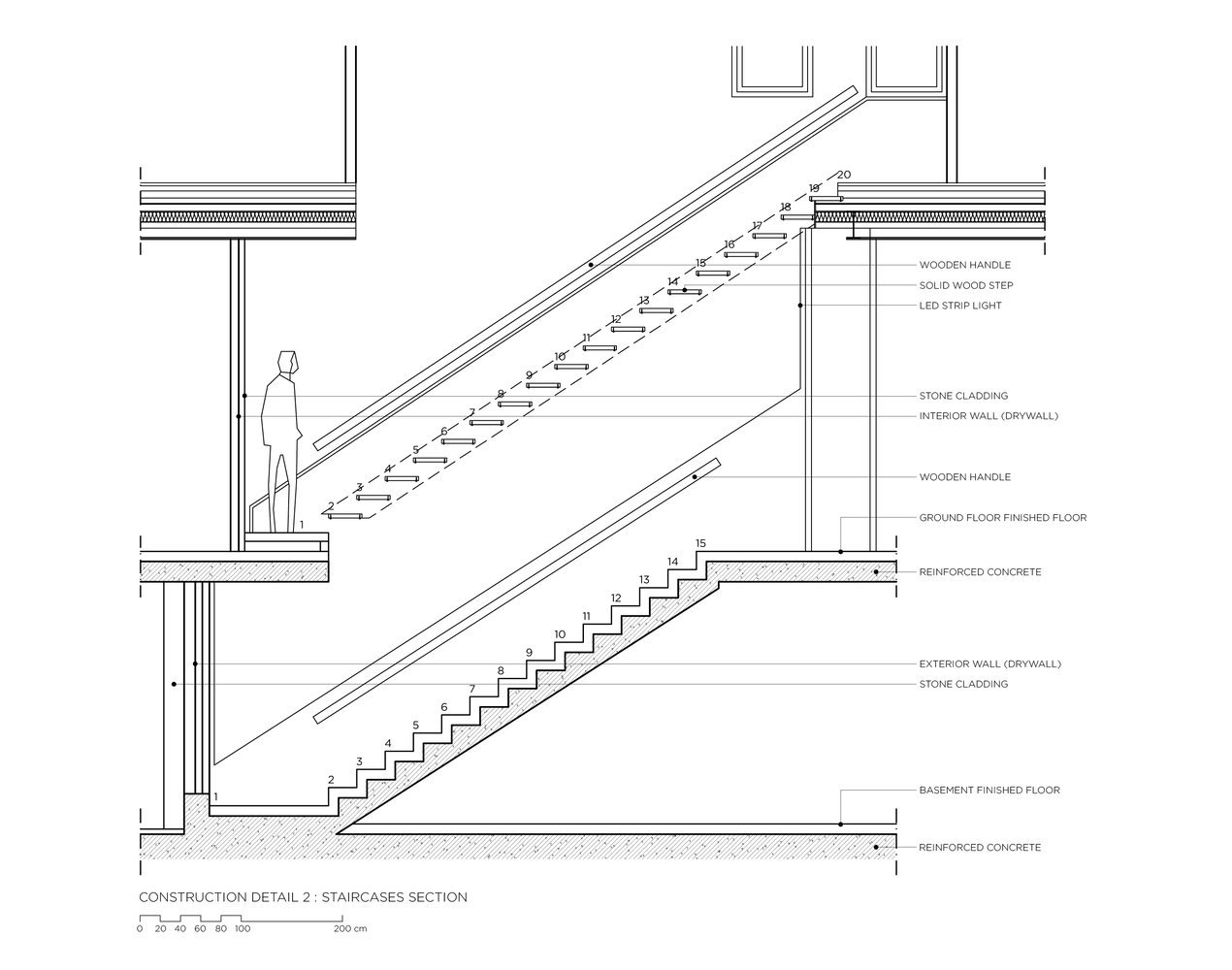 طبقه همکف به عنوان پایه ای شکل گرفت که هندسه حجم طبقه اول را پشتیبانی می کند. این پایه از طریق دیوارهای ضخیمی که با روکش سنگی محلی پوشانده شده اند، شکل گرفته است که کابینت های آشپزخانه و سایر وسایل انباری را در بر می گیرد. دیوار سنگی شرقی به منظور اطمینان از حریم خصوصی فضاهای بیرونی اصلی زندگی به علاوه برای محافظت از حیاط اصلی در برابر باد غربی، به طول سه متر امتداد دارد.