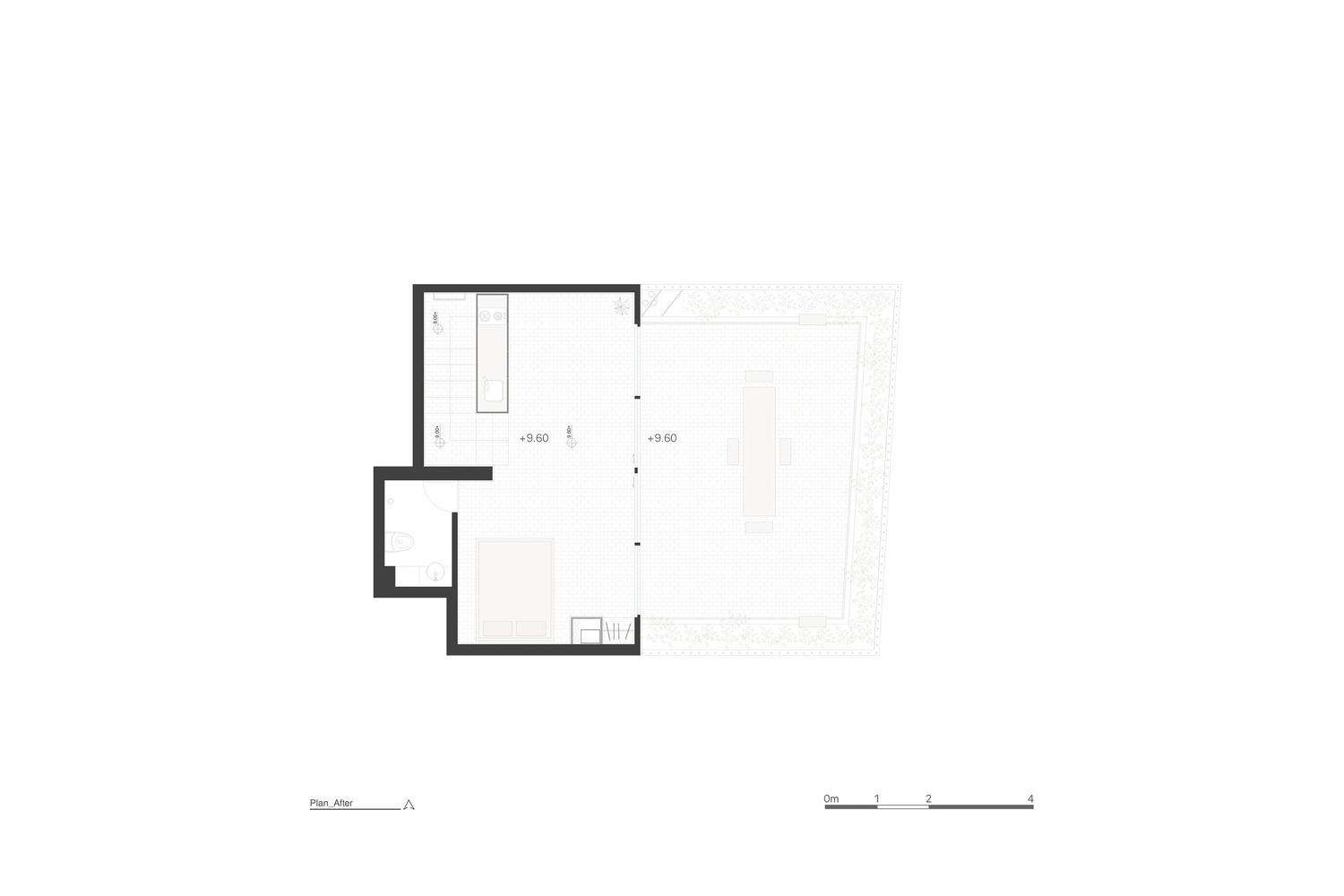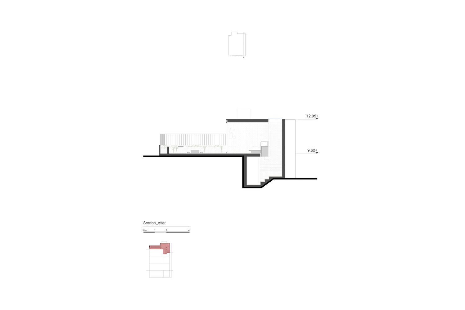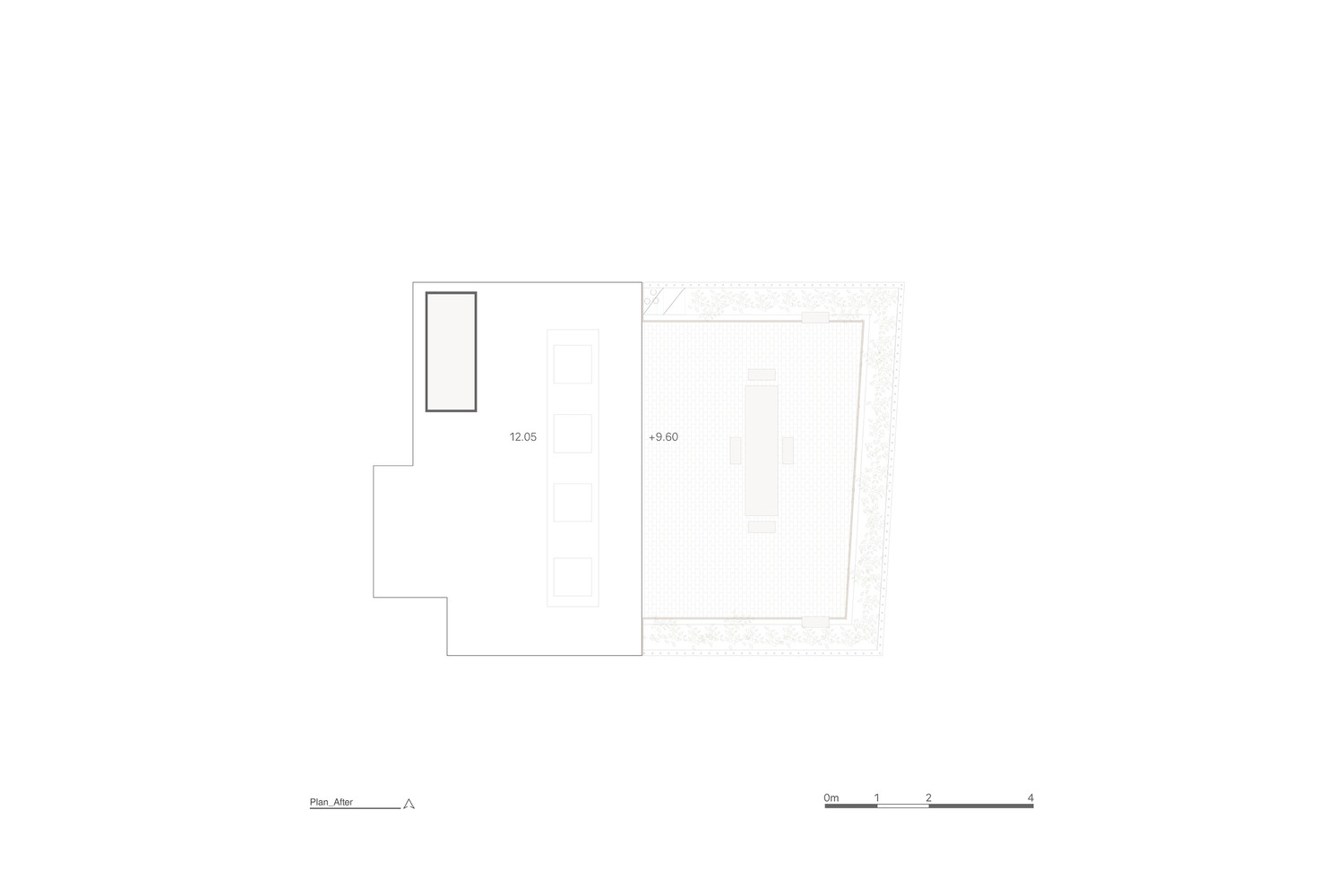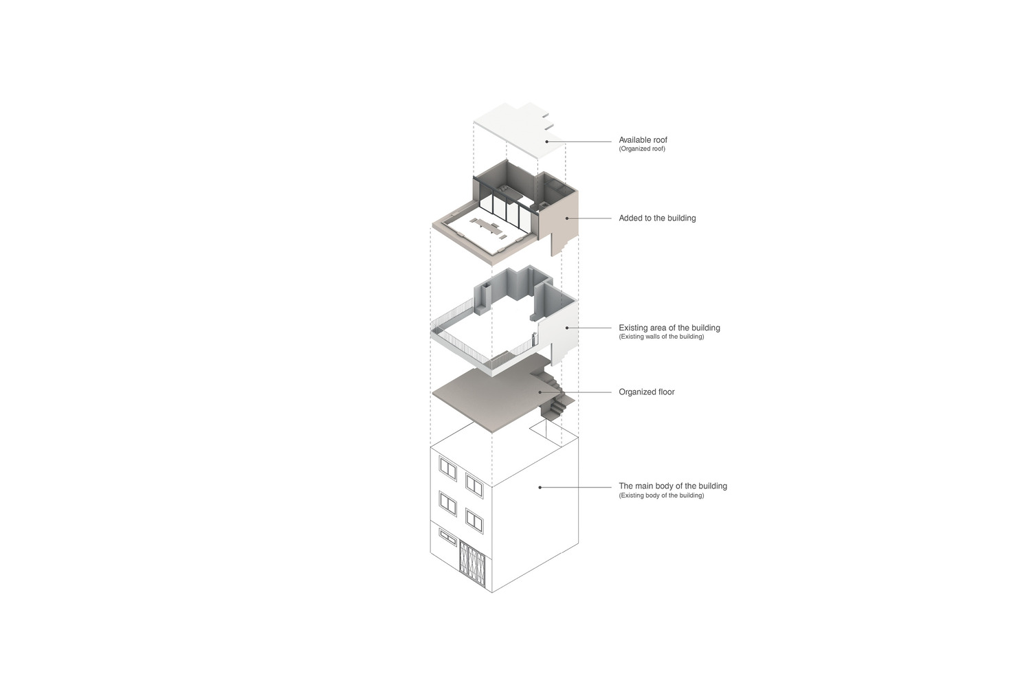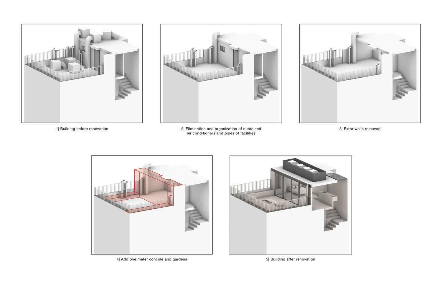 جزئیات طراحی در ابتدا برای تبدیل لفت به اتاقی مناسب برای اقامت میهمانان، کانال ها، کولرها، لوله ها، تاسیسات و دیوارهای غیر ضروری حذف و تا حد امکان ساماندهی شده اند. سپس از طریق آرماتوربندی ساختمان، سقف را حدود یک متر کنسول زده اند، علاوه بر آن یک پنجره باز شونده در تمام جبهه شرقی تعبیه شده که در هنگام باز شدن، فضای داخلی و خارجی را یکسان می کند.
