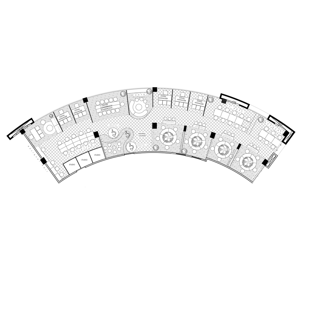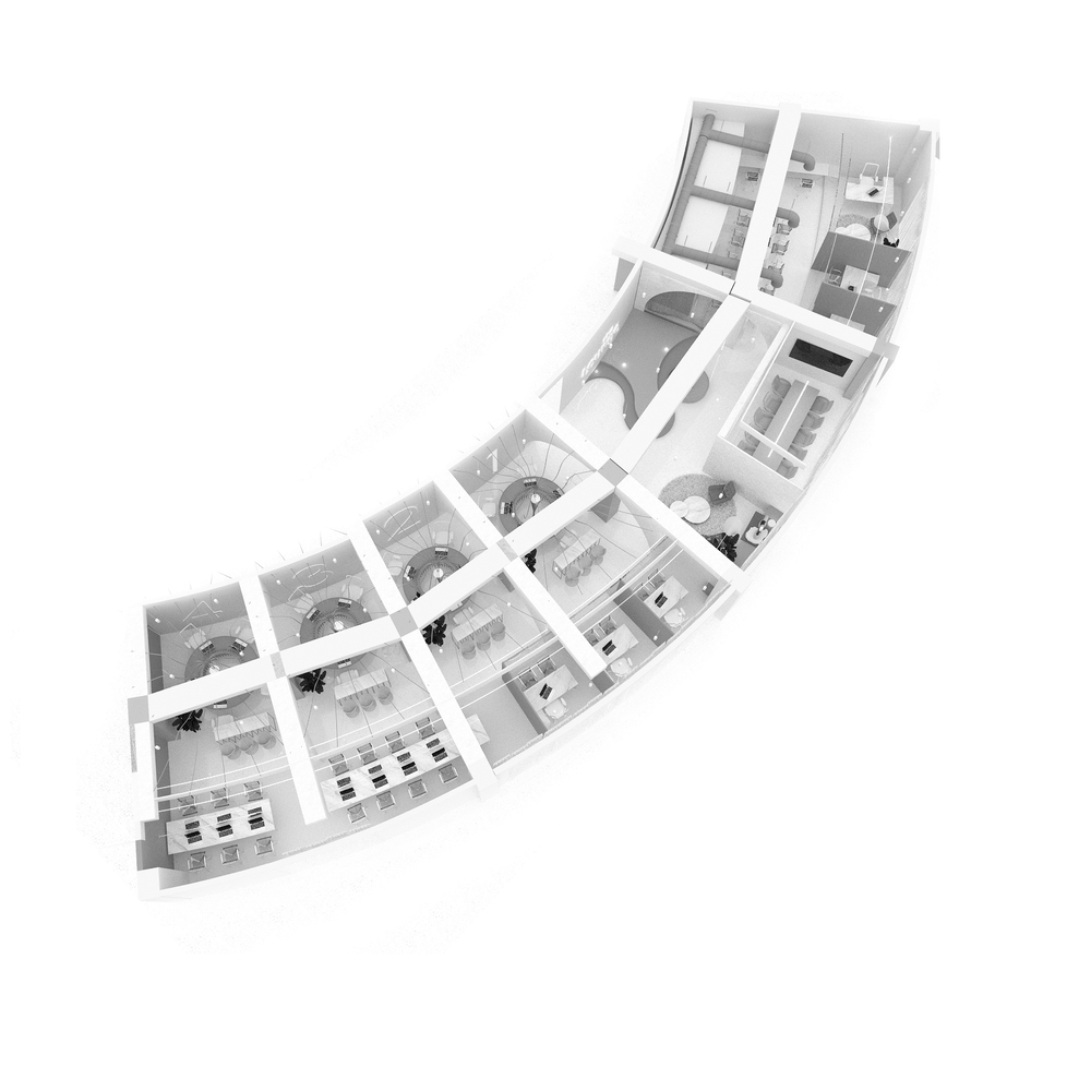 به محض ورود، سمت راست پلان طبقه به چهار گروه اصلی تقسیم می شود که هر کدام نماینده بخش های خاصی هستند. ایستگاه های کاری این فضای مدرن در زیر “درخت فلزی بدون برگ و در عین حال گسترده” پنهان شده اند. بقیه فضا در سمت راست به بخش‌ هایی اختصاص داده شده است که در جنبه آموزشی کسب و کار درگیر نیستند.