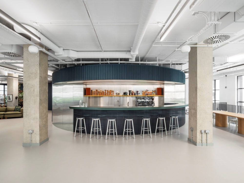 آشپزخانه ای که در یکی از حفره ها قرار دارد از فولاد ضد زنگ پوشانده شده است تا نور را منعکس کند و به عنوان یک مرکز متمایز اتاق، عمل کند که در ورودی به هسته اجتماعی دفتر تبدیل می شود. کاشی های سرامیکی لعاب دار دست ساز، میز پلاستیکی بازیافتی منحنی را دور زده اند. مبلمان، برای فعال کردن فضا و ایجاد فضایی خانگی و راحت در میان حفره ها و فضاهای منفی تشکیل شده بین حجم ها، با دقت انتخاب شده است.