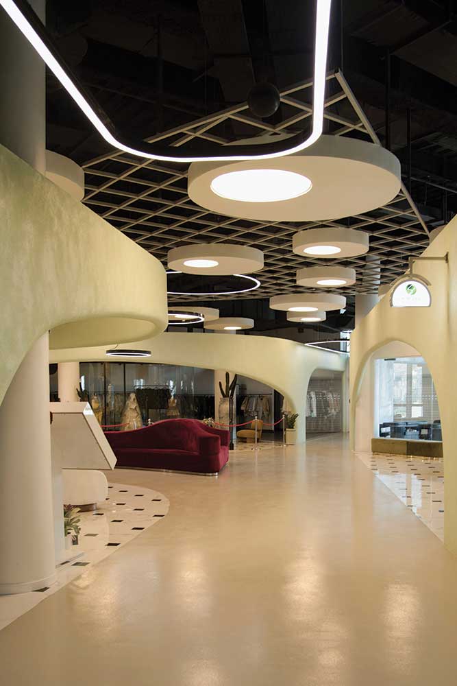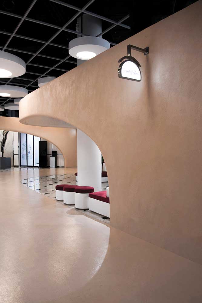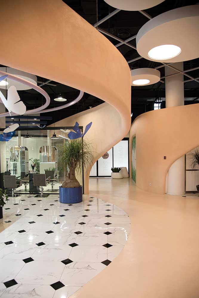 دیوارهای کانسپت: در جهت حفظ حریم هر کاربری، دیوارها علی رغم نقش جداکنندهی درون و بیرون، مسئولیت پویایی فضا را نیز ایفا میکنند و فرمهای لطیف زنانه و رنگهای شاد را به خود گرفتهاند. علاوه بر این در راستای حفظ حس یکپارچگی مجموعه ارتفاع دیوارهای کانسپت کوتاهتر از دیوارهای اصلی در نظر گرفته شد.