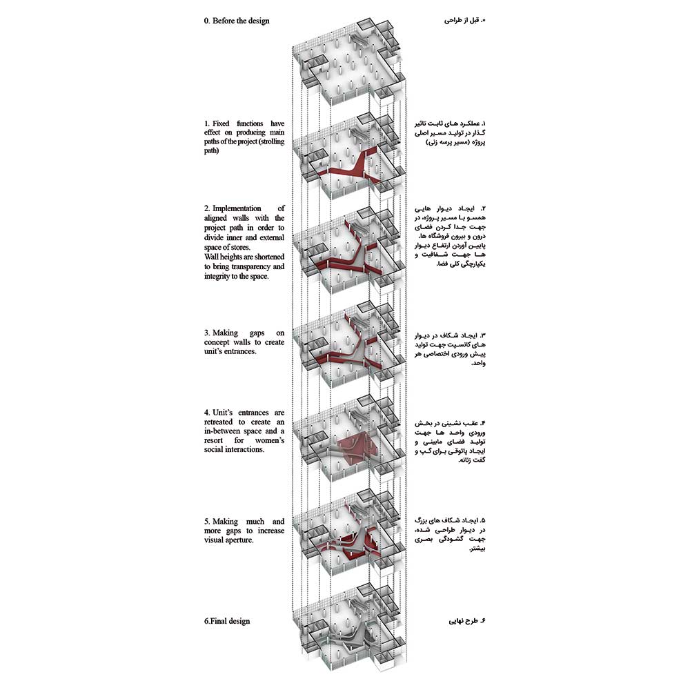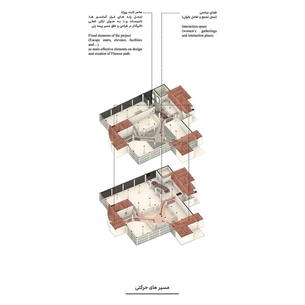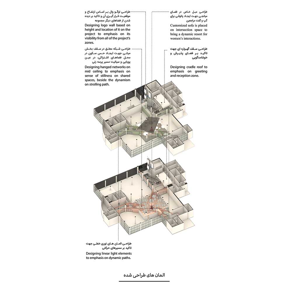 از یک طرف محدودیت های وضع موجود پروژه موجب شد تا عناصر ثابت مانند دسترسی های عمودی، محل پله های فرار، سیستم تاسیسات مکانیکی و تهویه مطبوع را به عنوان ارکان اصلی طراحی در برنامه ریزی فضایی بشناسیم. از طرف دیگر ماهیت کاربری های تعریف شده می بایست هم شخصیت مستقلی داشته باشند، هم هدف یکسانی را دنبال کنند. بدین منظور ۸ واحد با کاربریهای مکمل در کنار هم قرار گرفتند که نیاز به خلق فضایی به عنوان فصل مشترک داشتند که موجبات گپوگفت زنانه را فراهم کند.