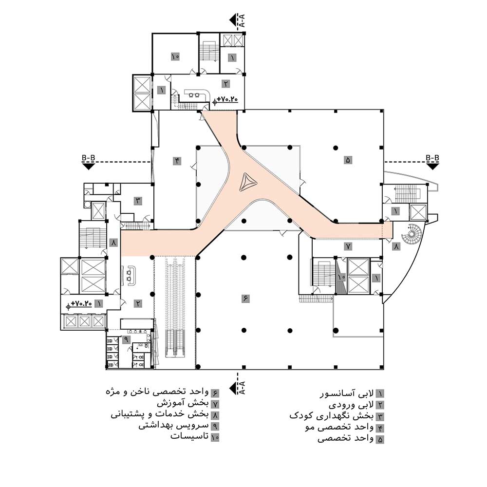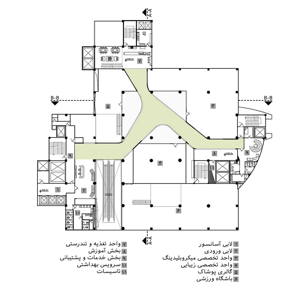 مسیر پرسه زنی: سازماندهی فضاهای داخلی بر پایهی مسیر اتصالدهندهی لابیهای پله فرار و آسانسور در سه وجه طبقه شکل گرفته و با استفاده از بافت و رنگ خاص، حس دیده شدن را از بدوِ ورود به مخاطب القا میکند.
