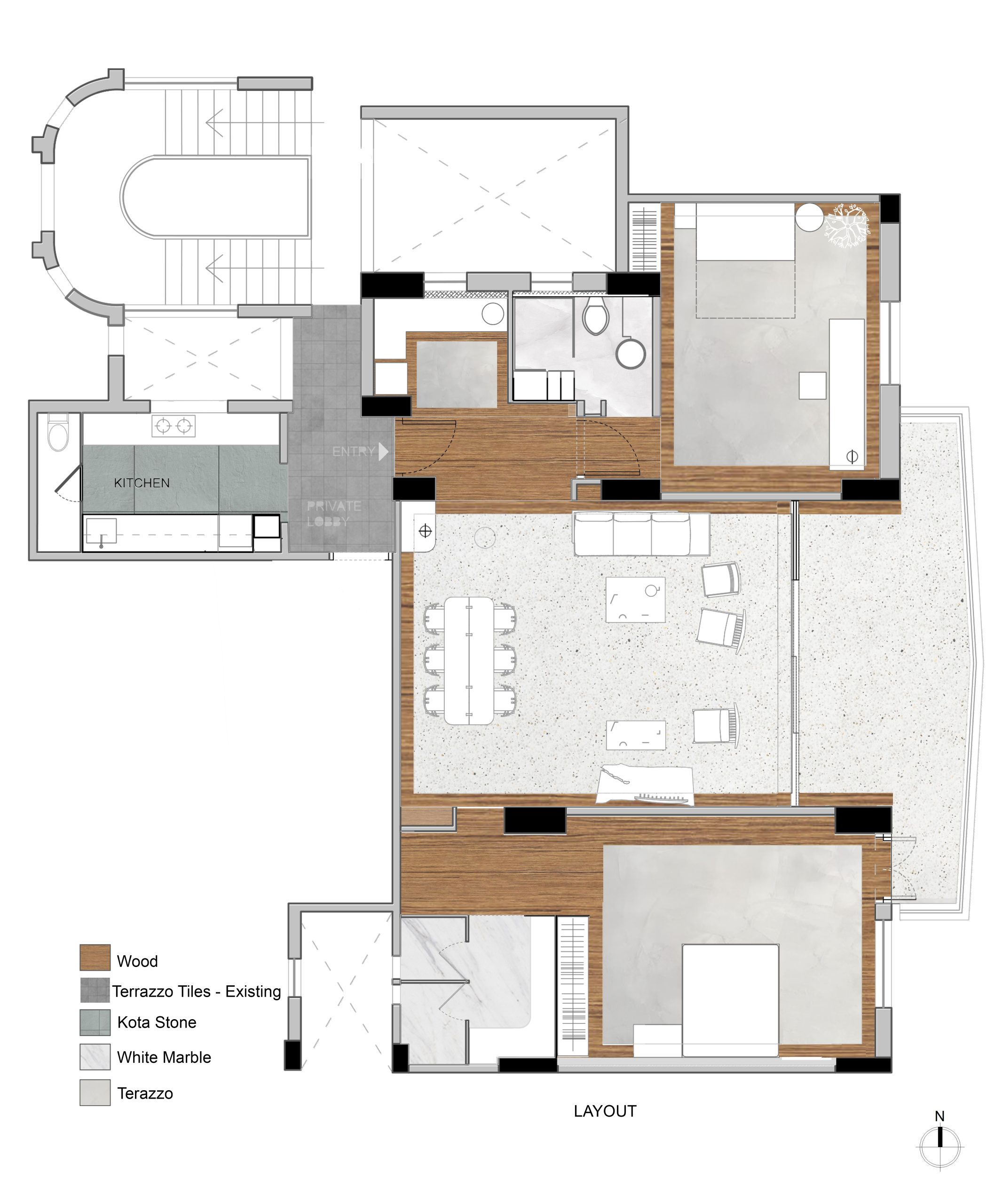 پالت رنگ و متریال به دقت تنظیم شده است تا فضایی آرام و هماهنگ ایجاد کند. دیوارهای ساخته شده با لیموواش خلوص و روشنایی را تداعی می کنند. چوب ساج احیا شده برای درها، پنجرهها و کمد لباسها با جزئیات برنجی و دستههای چوبی عجیب و غریب، جذابیت قدیمی را با لمس مدرن ترکیب می کند. کفپوش Terrazzo، با حاشیه های چوبی ضخیم و حاشیه، گرما و شخصیت را القا می کند. روکش مرمر هندی در دستشویی ها حسی از تجمل و پیچیدگی را اضافه می کند. برای القای حس آرت دکو، وسایل روشنایی از Taherallys و Maroo Lights به صورت استراتژیک ترکیب شده اند.