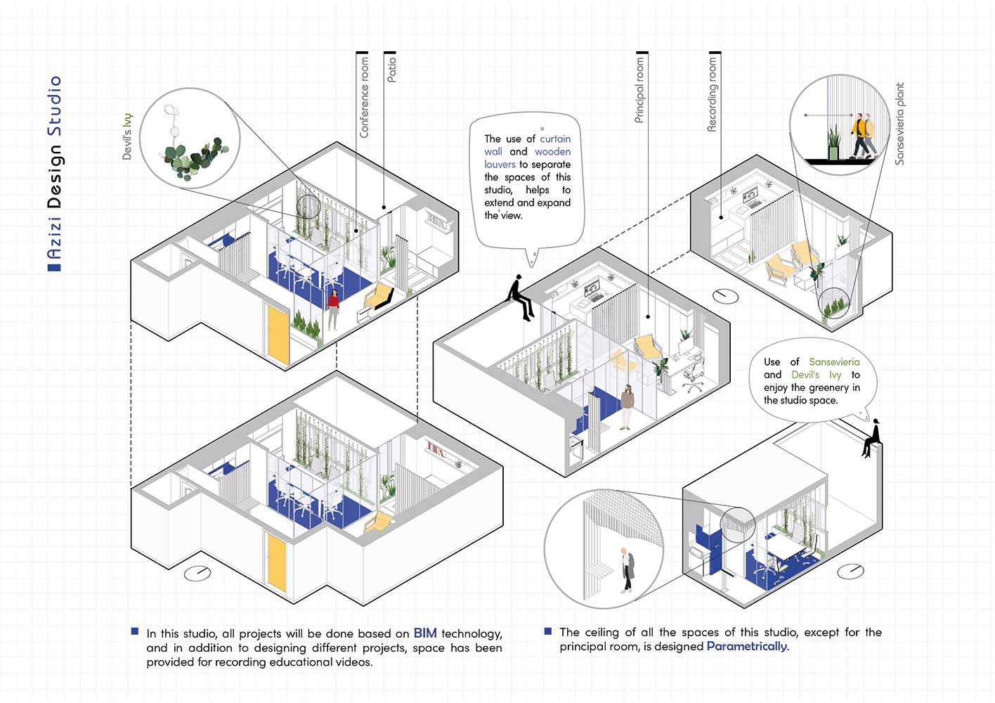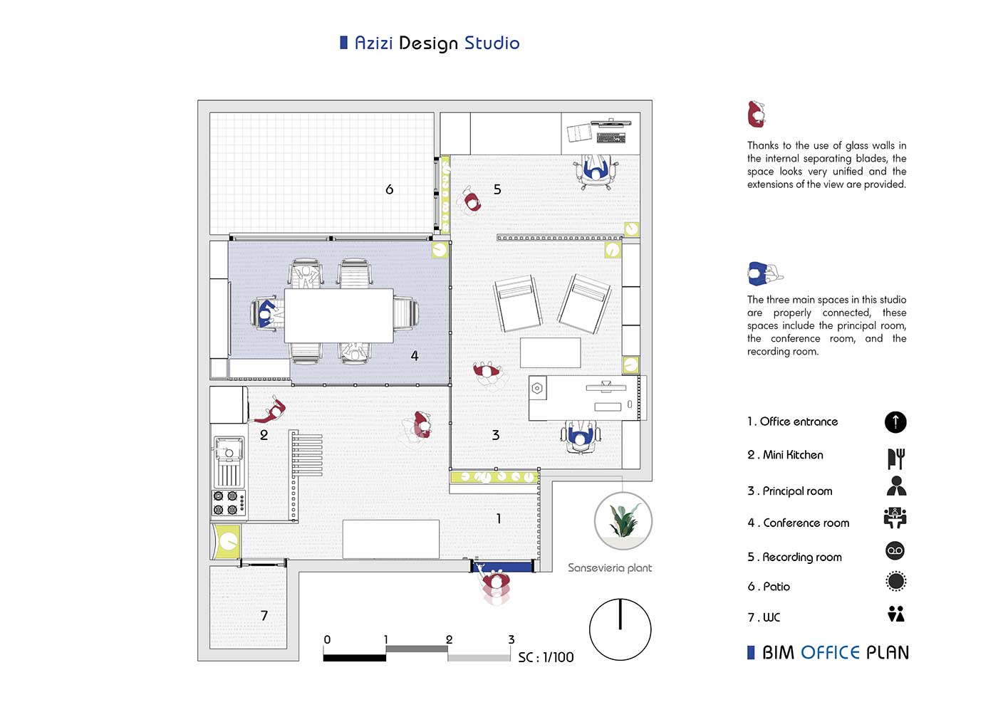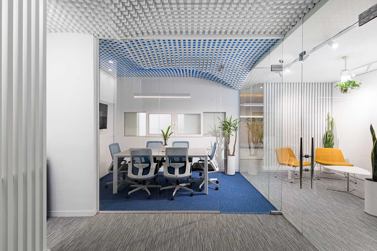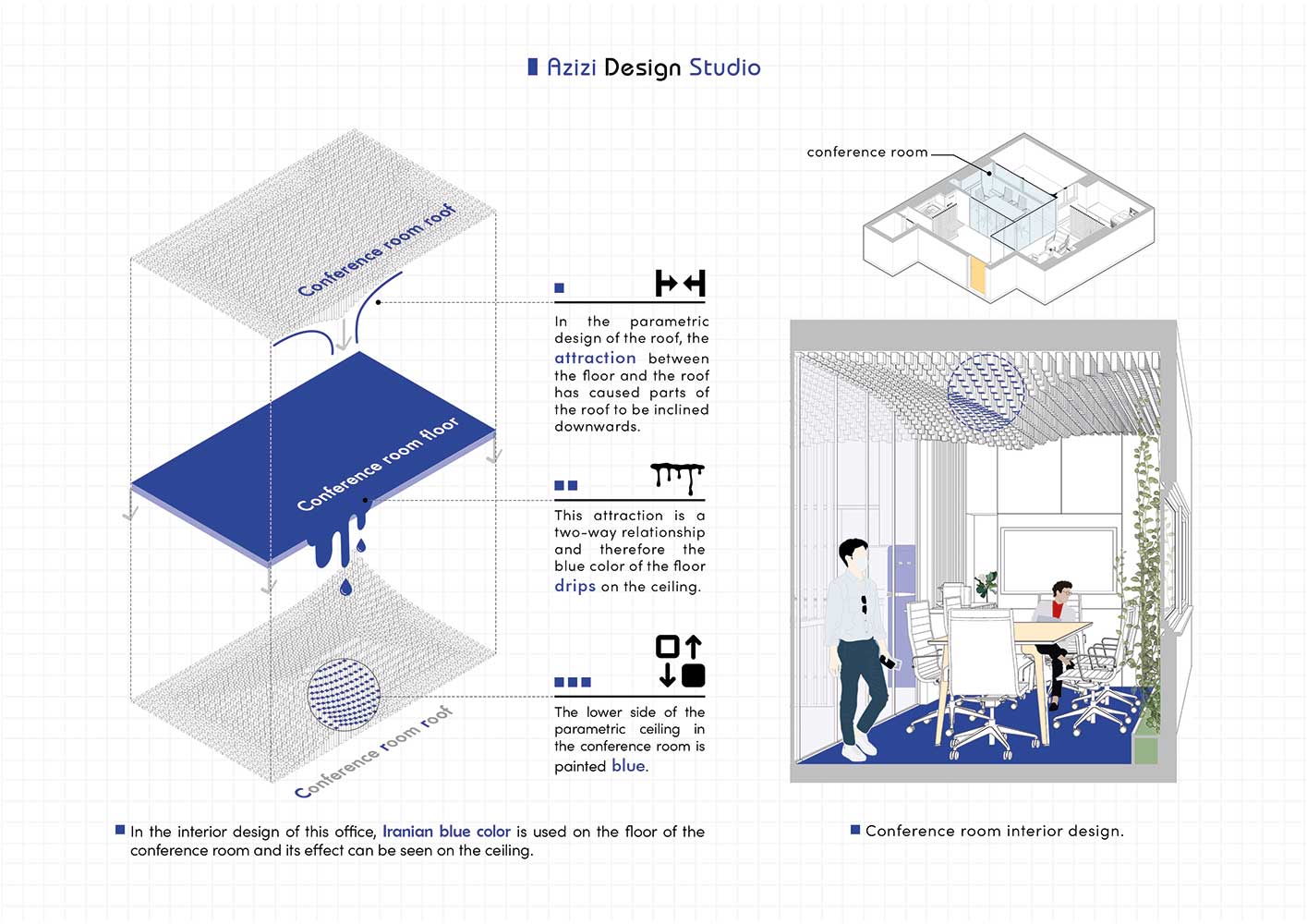 پس از این جابه جایی فضای لازم برای طراحی اتاق جلسات ایجاد شده است. در استفاده از رنگ برای کف و بخش انتهایی سقف و برش اخر لوورهای پارامتریک از رنگ آبی ایرانی استفاده شده است. سقف پروژه که در امتداد لابی قرار دارد به صورت پارامتریک طراحی شده است. رنگ آبی مورد استفاده یک رنگ پرکاربرد در پیشینه معماری ایرانی است. این رنگ همچنین رنگ سازمانی پروژه و رنگ گرفته شده از تکنولوژی بیم نیز می باشد.