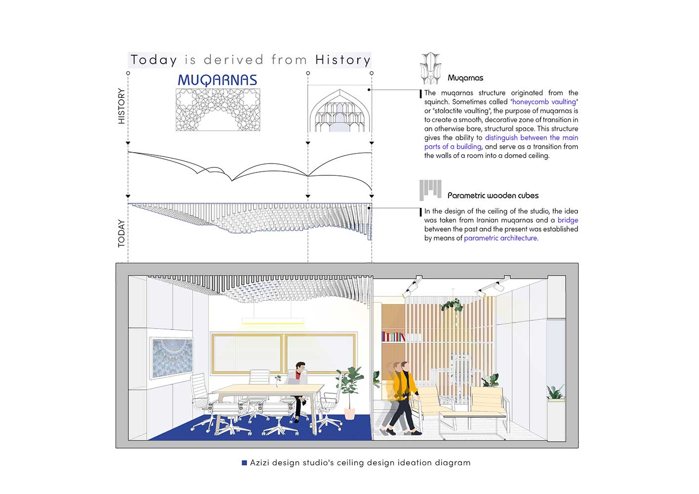 باید یادآوری کرد که سقف پارامتریک پروژه دفتر کار بیم آفیس به ویژه در بخش گوشه سازی ها از مقرنس سازی و گوشه سازی در معماری ایرانی برگرفته شده است. که به منظور دست یابی به این هدف از ۳۰۰۰ لوور پارامتریک استفاده شده است.
