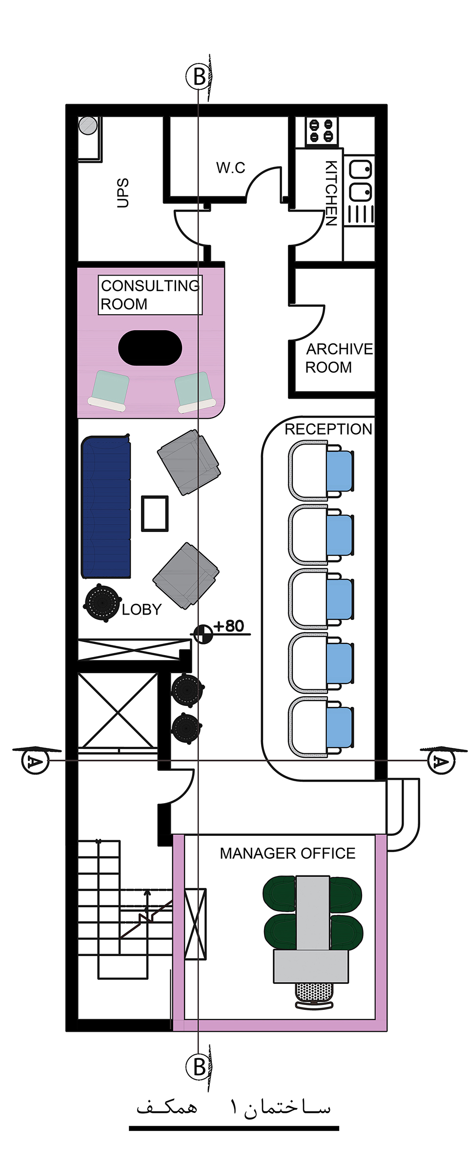 پس سیرکولاسیون حل شد. پس از این زمان چیدمان ریز فضا ها کنار هم فرا رسید. طبقه همکف ساختمان قدیمی برای فضای مدیریت، رسپشن و اتاق جلسات در نظر گرفته شد. در هر طبقه نسبت به تعداد کارکنان آن طبقه،سرویس بهداشتی و اتاق رختکن و آبدارخانه در نظر گرفته شده است.