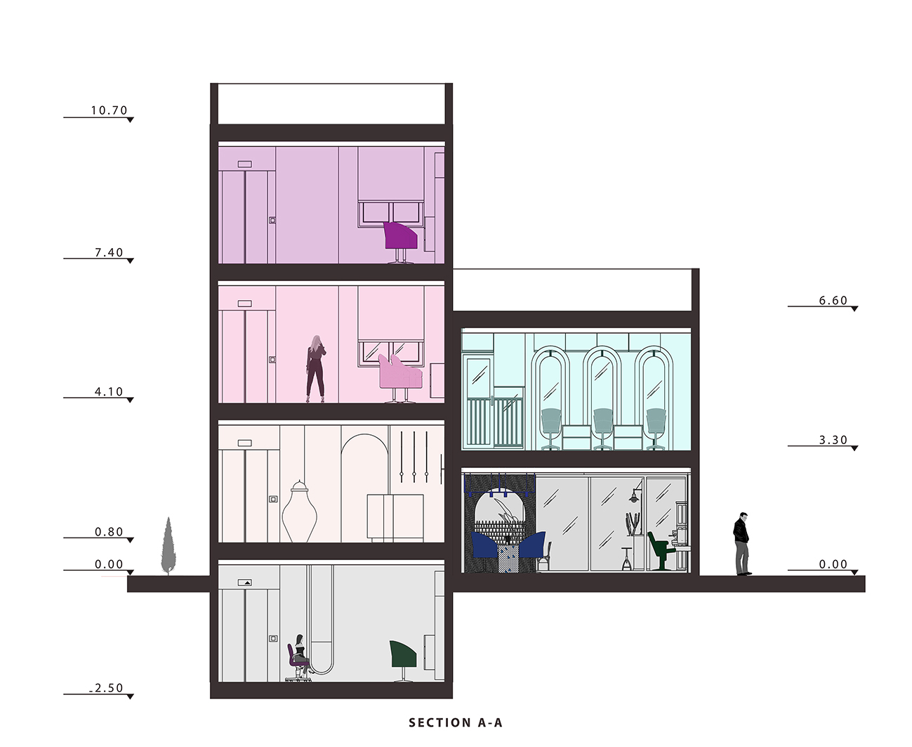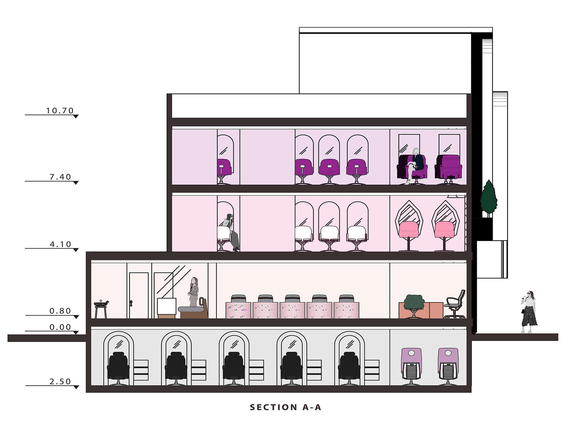 در این صورت متراژ قابل بهره برداری ساختمان پاسخگوی نیازهای کارفرما محترم نبود. پس تصمیم به بازسازی اساسی پروژه گرفته شد. در ابتدا تیم طراحی تصمیم گرفتند تا ساختارهای ارتباطی عمودی و افقی بین ریز فضای سالن های زیبایی را کاملا شناخته بشناسند تا بهتر بتوانند سیرکولاسیون پروژه را تعریف کنند.