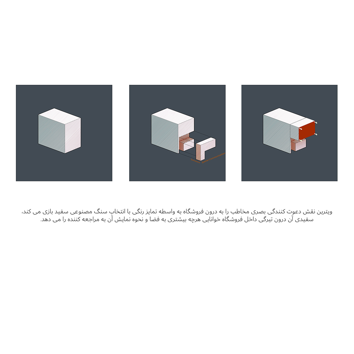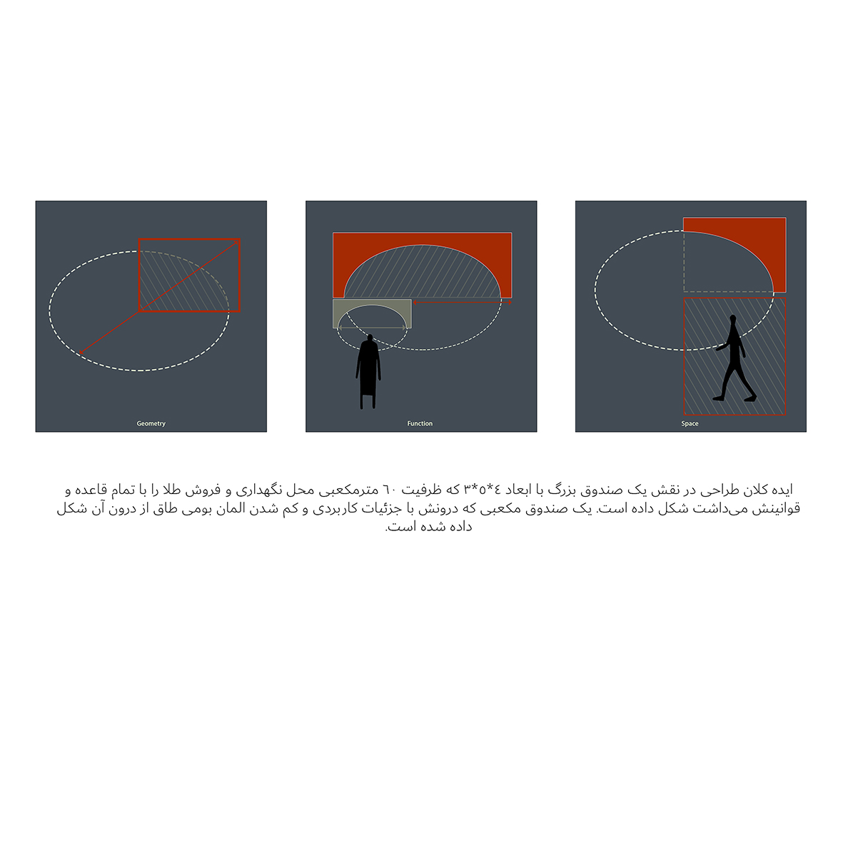 ایده کلان طراحی در نقش یک صندوق بزرگ با ابعاد ۴*۵*۳ که ظرفیت ۶۰ مترمکعبی محل نگهداری و فروش طلا را با تمام قاعده و قوانینش می داشت شکل داده است. یک صندوق مکعبی که درونش با جزئیات کاربردی و کم شدن المان بومی طاق از درون آن شکل داده شده. مفصل ارتباطی و اتصال این دو فرم با چرخش ۹۰ درجه به سمت ورودی، طاق نیم گنبدی را ایجاد می کند، با استفاده از ظرفیت آیینه در جداره سردرب ورودی تصویر گنبدی کامل در بدو ورود به نمایش گذاشته شده است. مخاطب از داخل پیاده رو درک فضای گنبد گونه را بر ورودی ویترین سفید معلق درک میکند و نگاه مخاطب به واسطه تمایز سفیدی و سیاهی سردرب و انعکاس صدا در زیر گنبد جذب می گردد.
