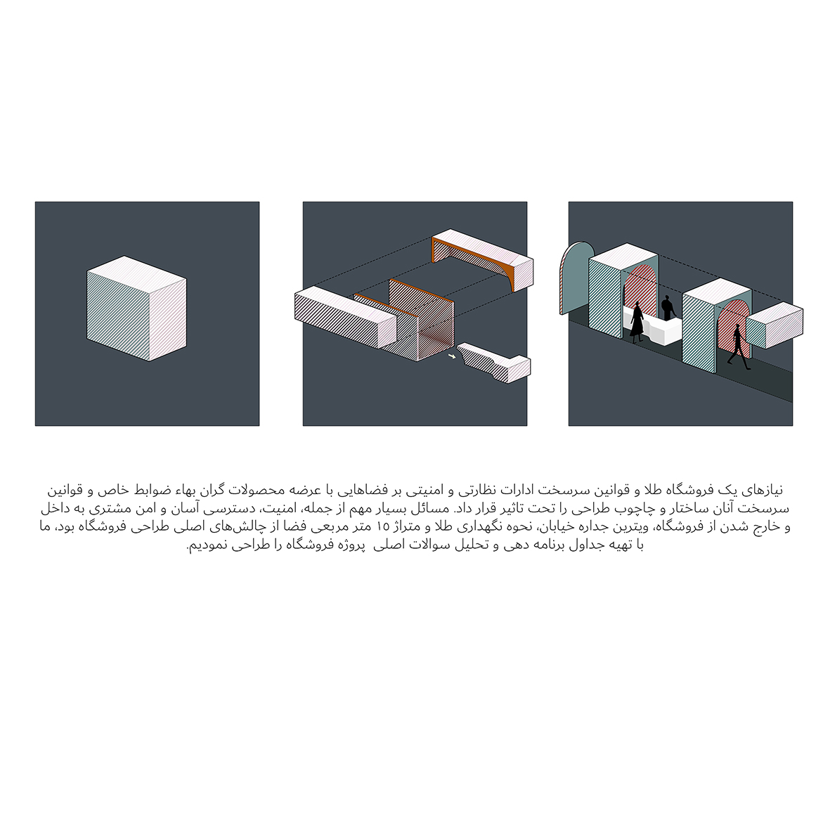 نیازهای یک فروشگاه طلا و قوانین سرسخت ادارات نظارتی و امنیتی بر فضاهایی با عرضه محصولات گران بهاء ضوابط خاص و قوانین سرسخت آنان ساختار و چاچوب طراحی را تحت تاثیر قرار داد. مسائل بسیار مهم از جمله، امنیت، دسترسی آسان و امن مشتری به داخل و خارج شدن از فروشگاه، ویترین جداره خیابان، نحوه نگهداری طلا و متراژ ۱۵ متر مربعی فضا از چالشهای اصلی طراحی فروشگاه بود، ما با تهیه جداول برنامه دهی و تحلیل سوالات اصلی پروژه فروشگاه را طراحی نمودیم.