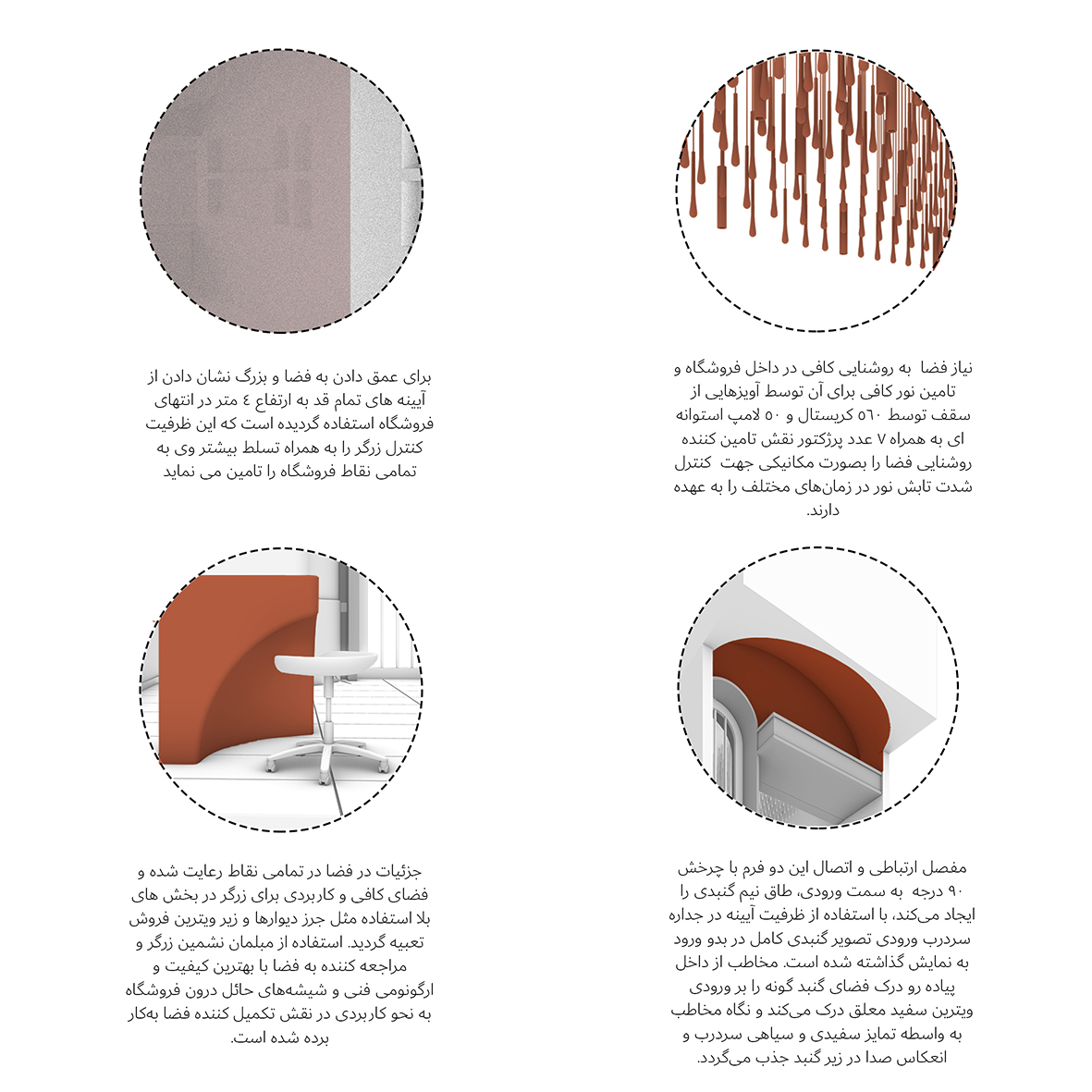 از این رو برای استفاده حداکثری از فضا فروشگاه با استفاده از انحناء در کانتر فروش به سراغ سنگ مصنوعی رفتیم که به واسطه تهیه قالب درون کوره فرم و شکل آن را قوس دار ساختیم. و در محل فروشگاه نصب گردید برای تهیه این قوس با تناسبات یک به یک درون فضا خطوط اصلی قوس را طراحی و الگو برداری کردیم. سپس با ایجاد شیارهای به وسیله شیشه و پنلهای گچی این ترکیب را با سایر جزئیات فضا همگون کردیم. و در انتهای فروشگاه با ایجاد یک نیم گنبد ظرفیت میز کار مشتری را برای مراجعه کننده ایجاد نمودیم.
