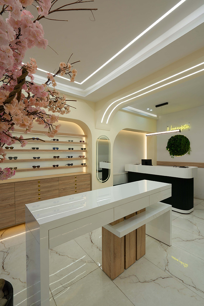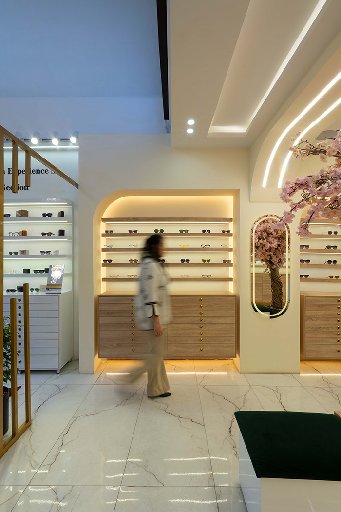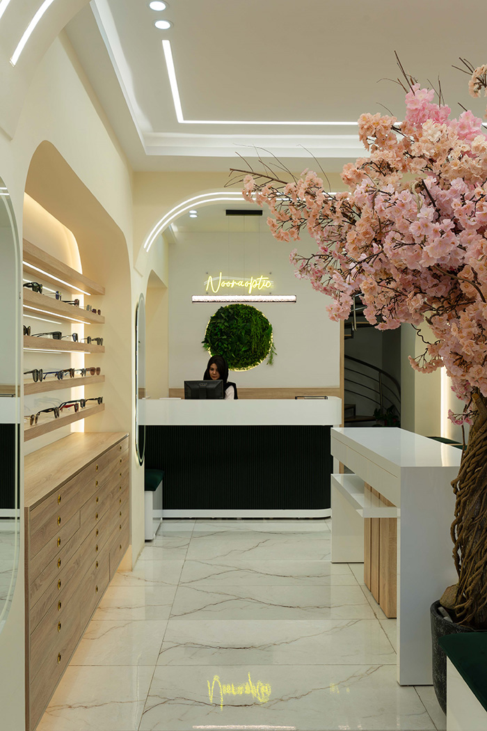 در قلب فروشگاه، یک گلدان بزرگ با شکوفههای صورتی به عنوان یک عنصر طبیعی آرامشبخش و پر جنب و جوش عمل میکند که با پالت سبز غالب در تضاد است و تجربه کاربری را بهبود میبخشد. فرمهای قوسی، مبلمان، مصالح و نمایشگرهای رنگی عینک در دو طرف، درون قوسها قاب شدهاند، یک زبان طراحی در سقف و پایهها طنینانداز شده است تا وحدت فضایی را تضمین کند. قفسهها و کابینتهای چوبی، گرما و اصالت را به نمایش میگذارند و با تزئینات سبز متعادل میشوند تا فضایی هماهنگ و جذاب ایجاد کنند.