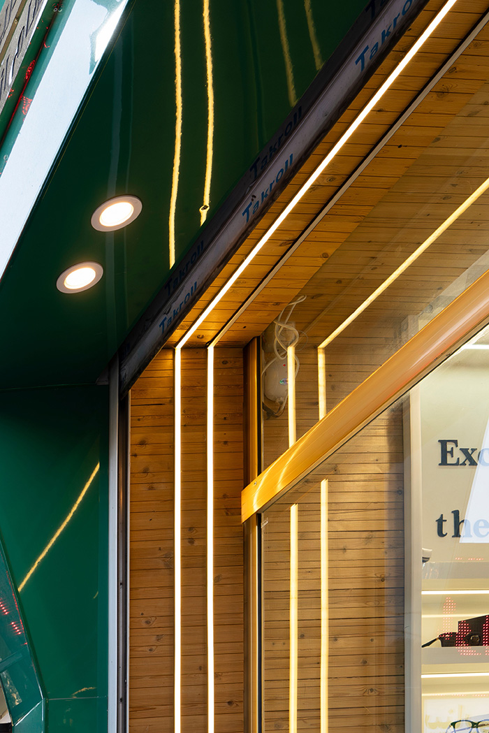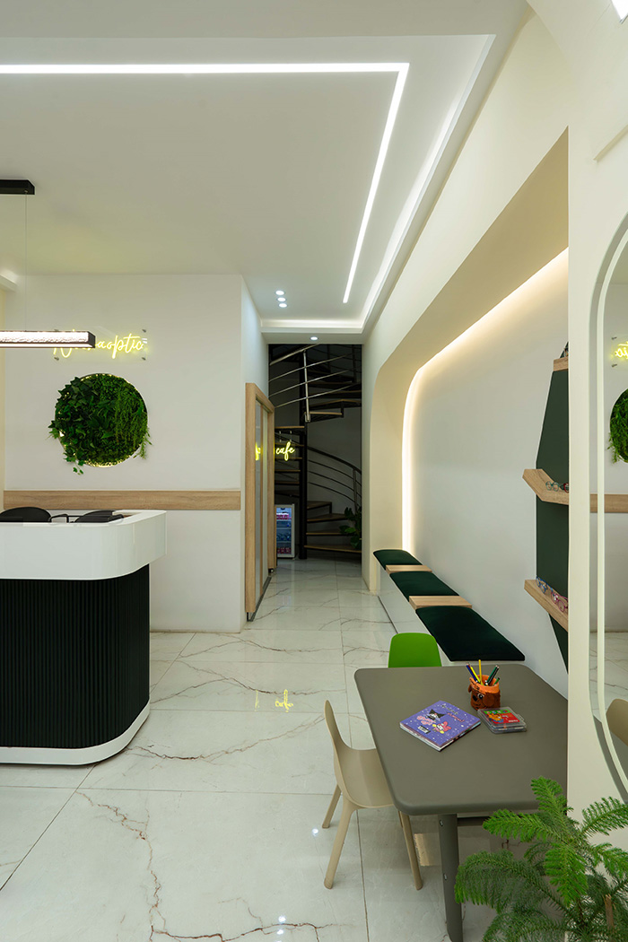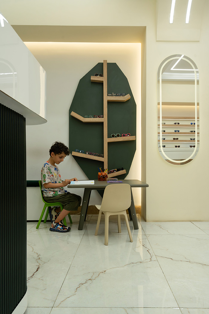رنگ سبز، که به عنوان یک عنصر راهنما و برجسته استفاده میشود، از قسمت بیرونی به داخل امتداد مییابد و به وضوح عملکرد فضا را تعریف میکند. در پشت پیشخوان پذیرش، گیاهان سبز و تداوم رنگ، این زبان طراحی را در داخل تقویت میکنند. چیدمان عملکردی و سازماندهی فضایی در طبقه همکف، چیدمان شامل بخشهای انتظار، پذیرش، معاینه، خردهفروشی عینک و تحویل کالا است. بخش ویژه (VIP) برای آزمایش و فروش عینکهای برند، در نزدیکی ویترین فروشگاه قرار داده شد تا یک تجربه خرید منحصر به فرد را فراهم کند. یک فرش قرمز کوچک، حس تجمل و تمایز را به این بخش اضافه میکند. برای ایجاد یک نقطه کانونی در فضای باریک، یک میز مرکزی به عنوان ایستگاه نمایش لنزهای اپتیکی و ابزاری برای هدایت گردش بازدیدکنندگان قرار داده شد.