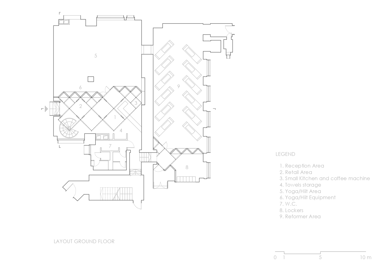این تیم طراحی مانند پروژه های قبلی خود، بر روی یک طراحی آزمایشی تمرکز کردند که تجربه فضایی یک استودیوی تناسب اندام را دوباره به تصویر می کشد. ورودی استودیو یک درب صنعتی محتاطانه است که در گذرگاهی بین حیاط خلوت پنهان شده است. پس از ورود، بازدیدکنندگان بلافاصله از تغییر شدید مناظر شگفت زده می شوند و از آنها دعوت می کنند تا در استودیو بیشتر کاوش کنند. هدف این طراحی ایجاد حس عمدی ورود به سوراخ خرگوش به دنیایی دیگر بود.