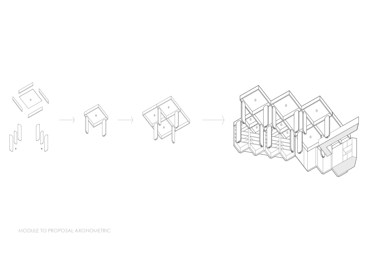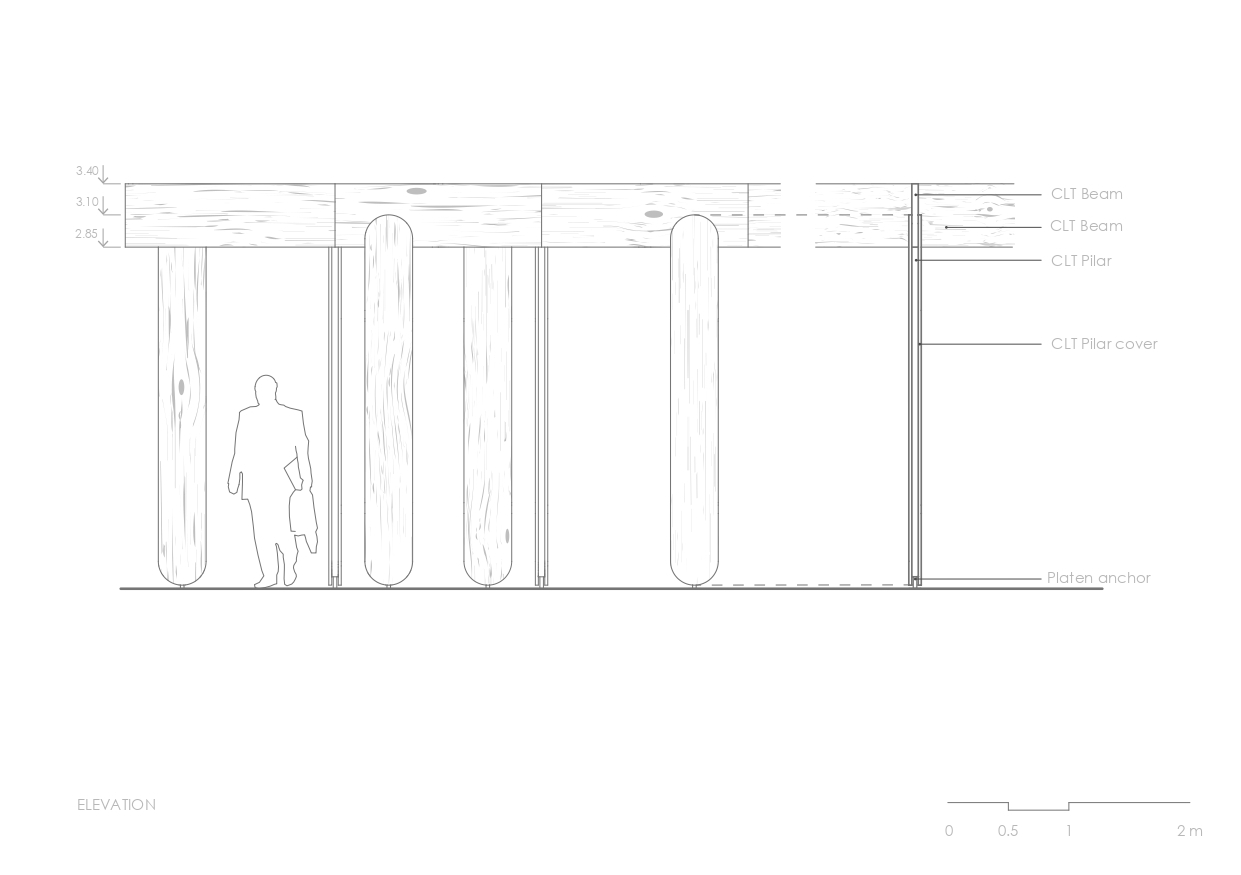 با توجه به ساختار مدولار، تیم طراحی تصمیم گرفتند نقطه مقابل بصری را بین یک سازه چوبی پیش ساخته چند لایه (CLT) در یک ساختمان آجری موجود آزمایش کنند. این امر بیش از حد ساختارهای خودپایدار را در قلمرو فضای داخلی برجسته می کند، که جلوه ای قوی از حقیقت، پناهگاه و مهار، به دور از یک فضای ساختگی و مصنوعی ساختگی ایجاد می کند. این رویکرد تضاد جالبی را با روش های سنتی طراحی داخلی نشان می دهد و بحث گسترده ای را در مورد چوب مکانیزه در ساخت و ساز باز می کند، که به ندرت به هاپتیک مربوط می شود.