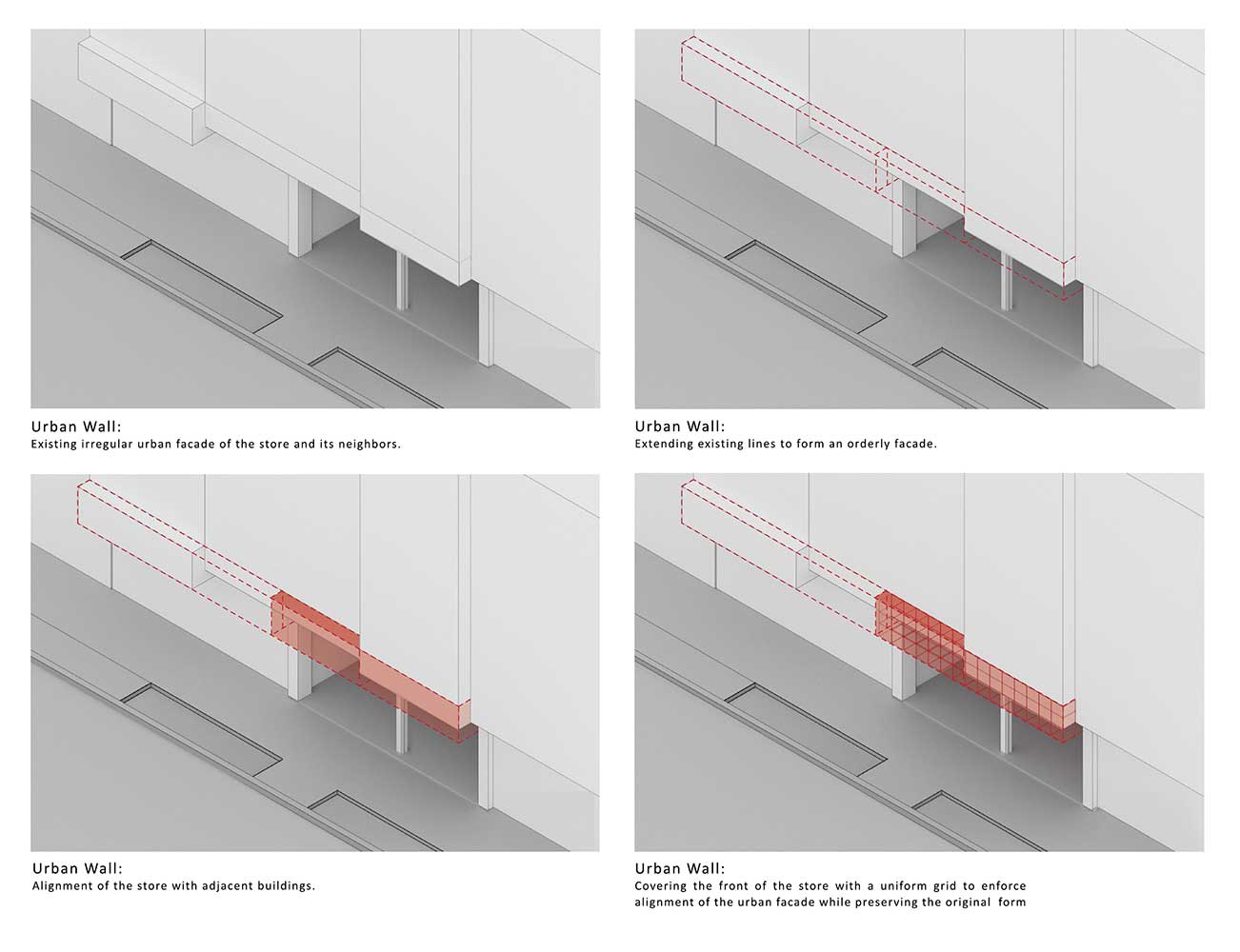 استفاده از هندسه سقف و امتداد آن در فضای بیرونی، بجز نظم بخشیدن به جداره پس و پیش شده پیشانی و امکان نصب برند فروشگاه، سعی در دعوت مخاطب به داخل دارد.