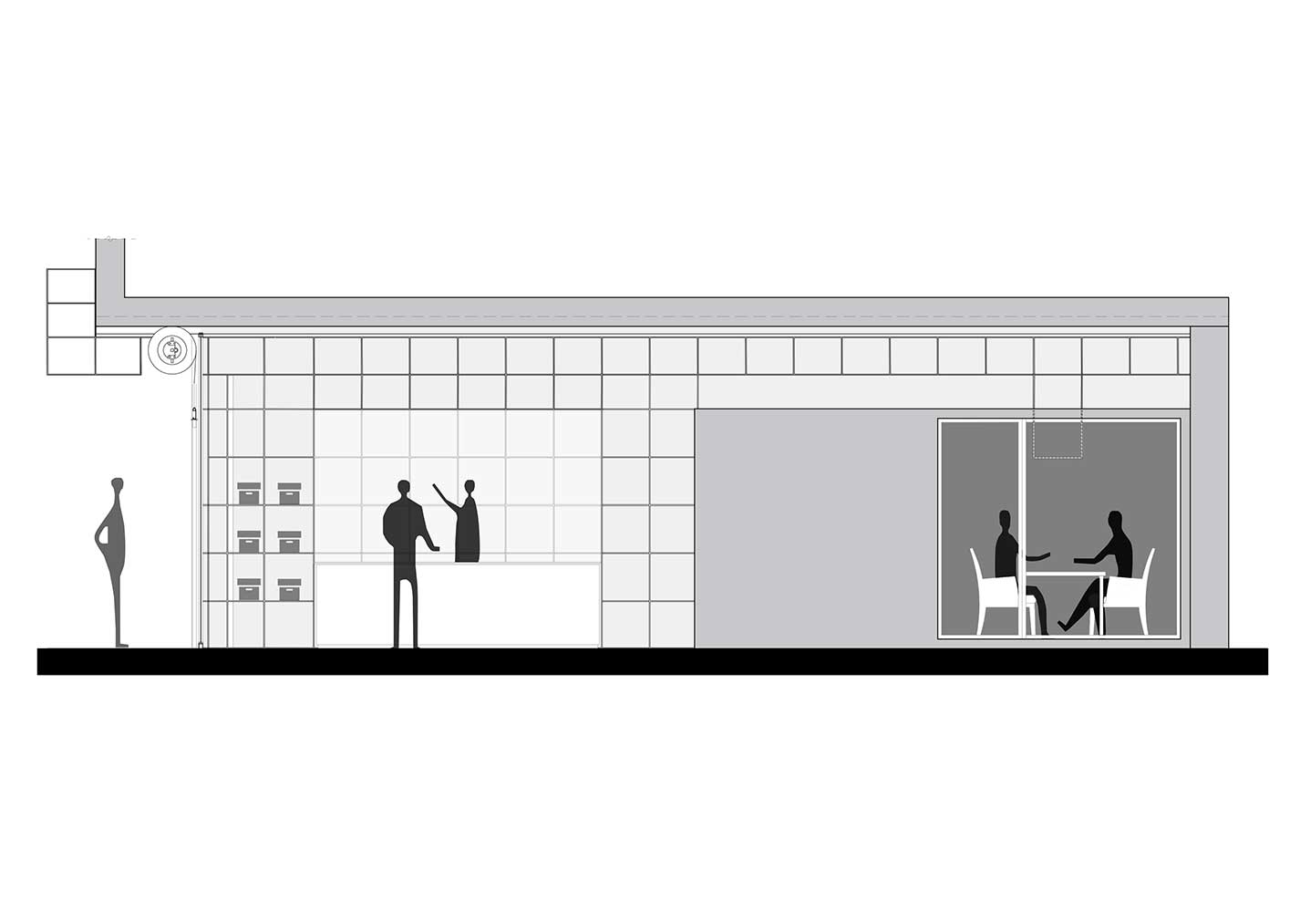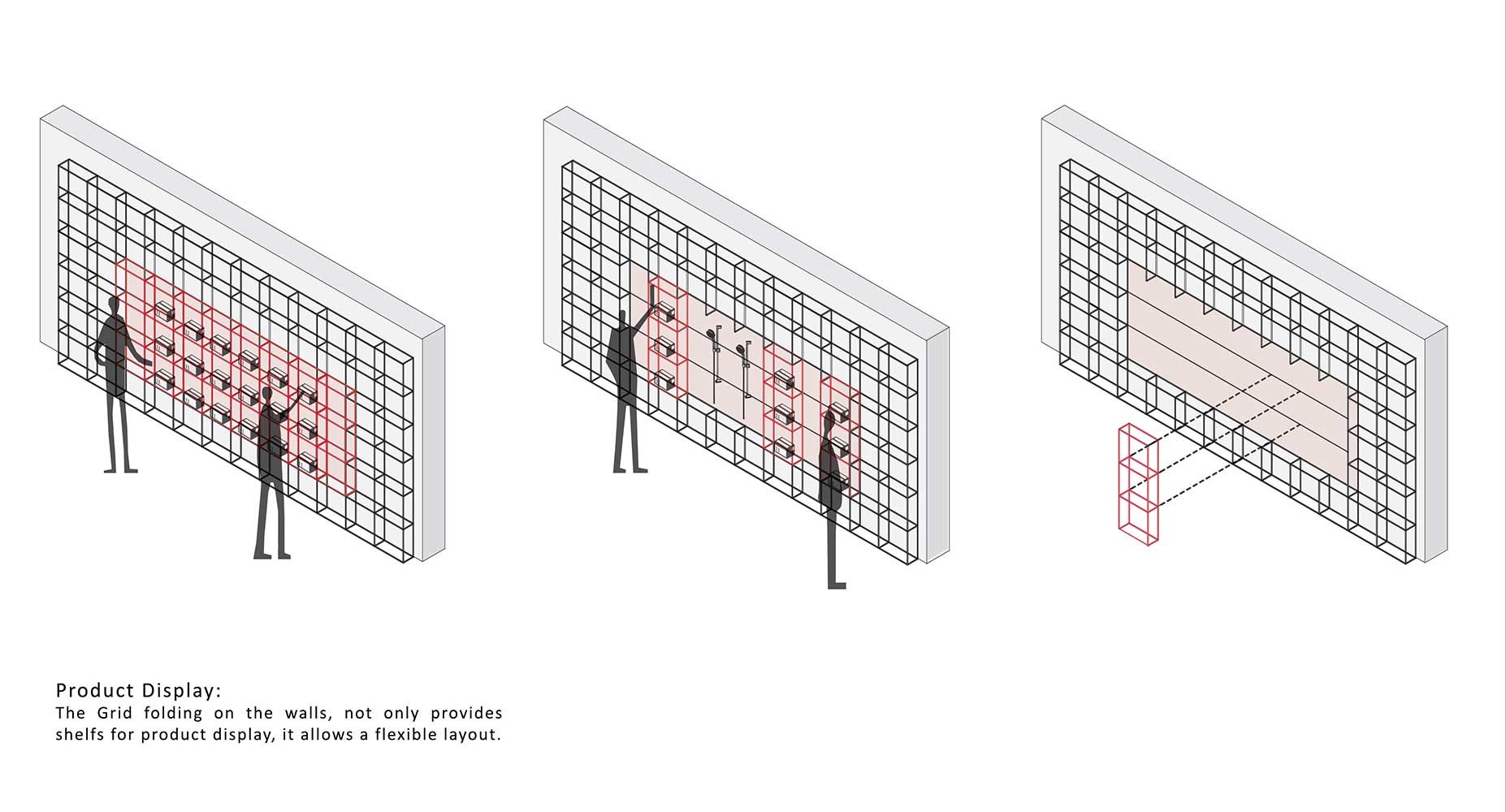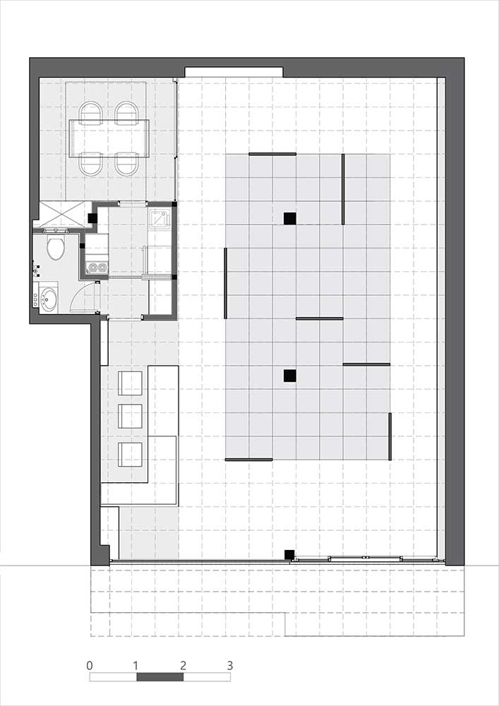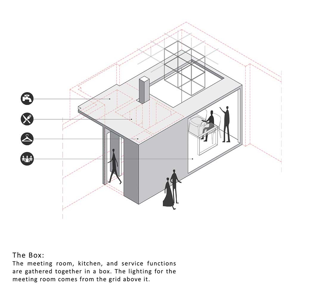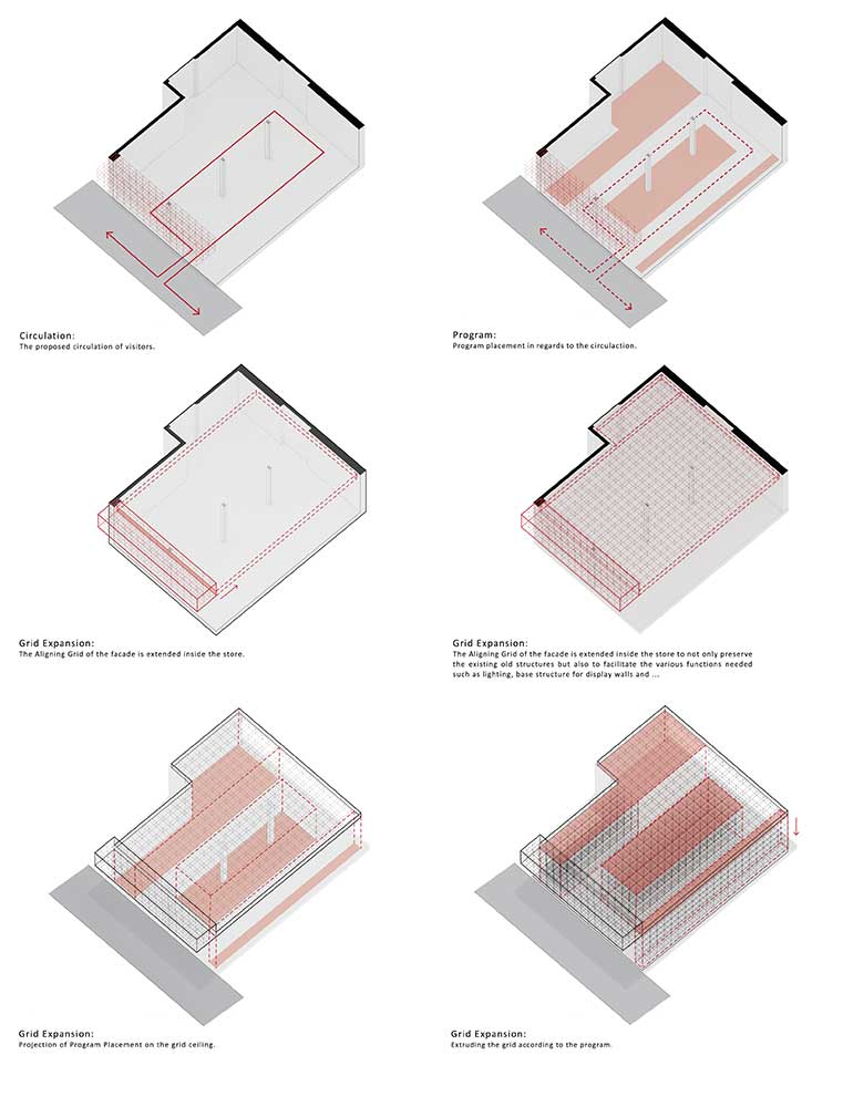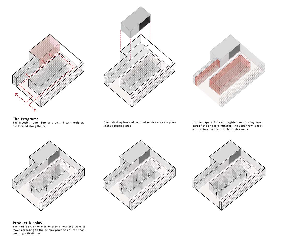 جانمایی فضاهای کانتر، انباری، سرویس، آبدارخانه و اتاق مدیریت در جداره پلان، فضای مفید حداکثری را در داخل برای عملکرد اصلی فضا مهیا نمود. در مرحلهی بعد، با توجه به ماهیت نمایشی دیوارههای مجاور ورودی، الگوهای مکعبی بر روی دیوارها تا شدند تا علاوه بر نمایش محصولات، بیننده فضای داخل را ویترینی برای این فروشگاه بیویترین تلقی نماید.