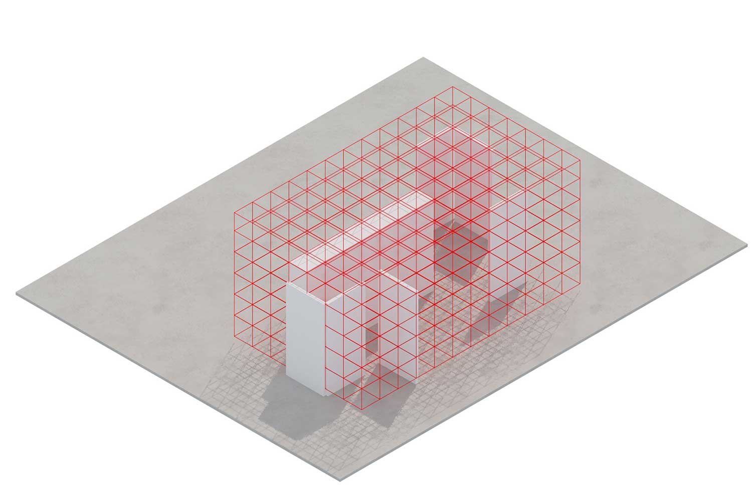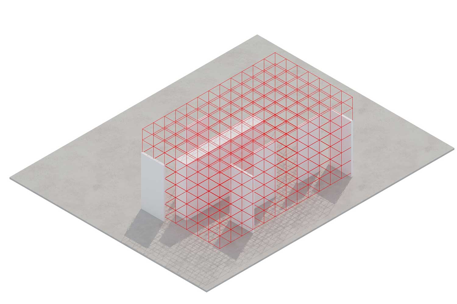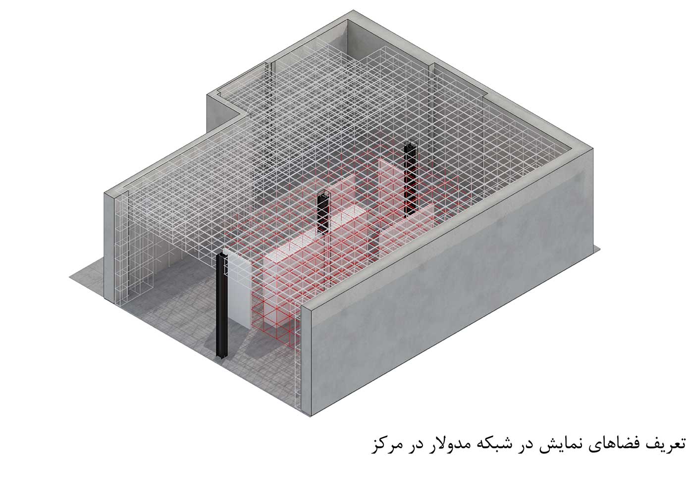 استفاده از شبکه مدولار گسترده که کل سقف فضا را پوشش می دهد، علاوه بر امکان تامین ایستایی صفحات نمایش در ابعاد و جهت های مختلف و عملی نمودن انعطاف پذیری، با ماهیت صنعتی موضوع قرابت مفهومی و بصری می یابد (کارفرما بنا به نیاز، امکان برپایی مجدد المان های معماری را به صورت های مختلف و منطبق بر نیازهای عملکردی خود خواهد داشت).