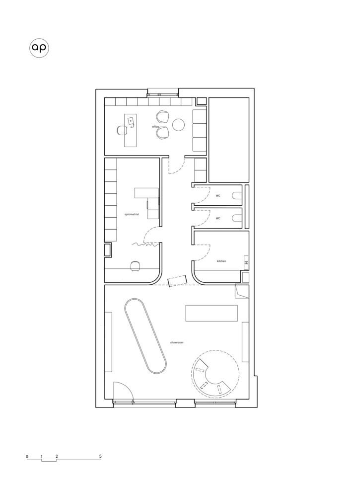 اساس آن خاک رس، چوب و فولاد است. خاک رس به عنوان ماده اصلی مورد استفاده در دیوارها به صورت گچ در اولویت قرار گرفت. گچ های سفالی فضا را به شکلی ارگانیک و سیال در می آورند که از نمایشگاه اصلی به پس زمینه، مطب و اتاق معاینه اپتیک جریان می یابد. به طور طبیعی مشتریان را از فضایی به فضای دیگر هدایت می کند.