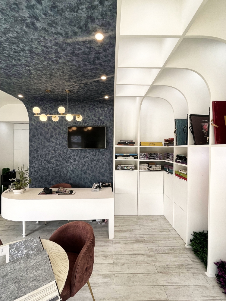 طراحی داخلی مدرن گالری آرمانی در استان خراسان رضوی در شهر نیشابور واقع شده است و به عنوان فضایی برای فروش مصالحی مانند آجر، کاغذ دیواری، آینه و … که در طراحی داخلی و برای پوشش دیوارهای داخلی مورد استفاده قرار می گیرند طراحی شده است. در سال های اخیر استفاده از چنین مصالحی رواج یافته و افراد روز به روز به دنبال متریال های جدید و شیک برای بازسازی و طراحی داخلی منازل و دفتر کار خود هستند. علاوه بر کیفیت مصالح لازم است خود فروشگاه نیز طراحی مناسبی داشته باشد. چرا که مخاطب در نگاه اول با فضای فروشگاه مواجه می شود. از این رو تصمیم بر بازسازی این فروشگاه گرفته شد. در بازسازی این پروژه دو مورد مهم اجرا شده است. اول اینکه فضاهای عملکردی مختلف و رابطه بین این فضاها، کاربران و نمایشگاه مورد توجه قرار گرفته است. مورد دوم مربوط به ارتباط فضا، موقعیت گالری و مالک است. بازسازی این پروژه با کاربری تجاری در سال ۱۳۹۹ به خواست کارفرما (آقای ماروسی) انجام شده است.