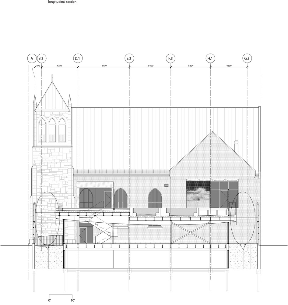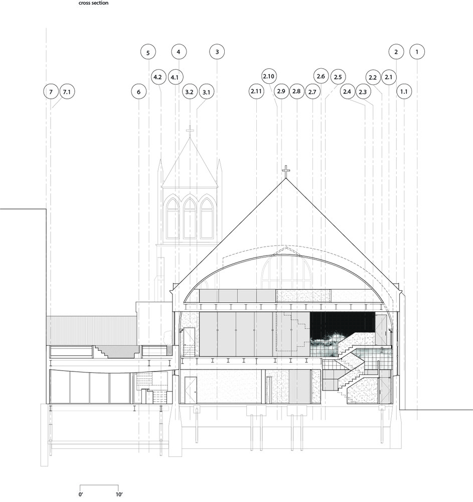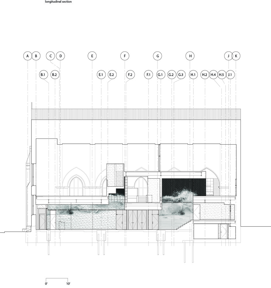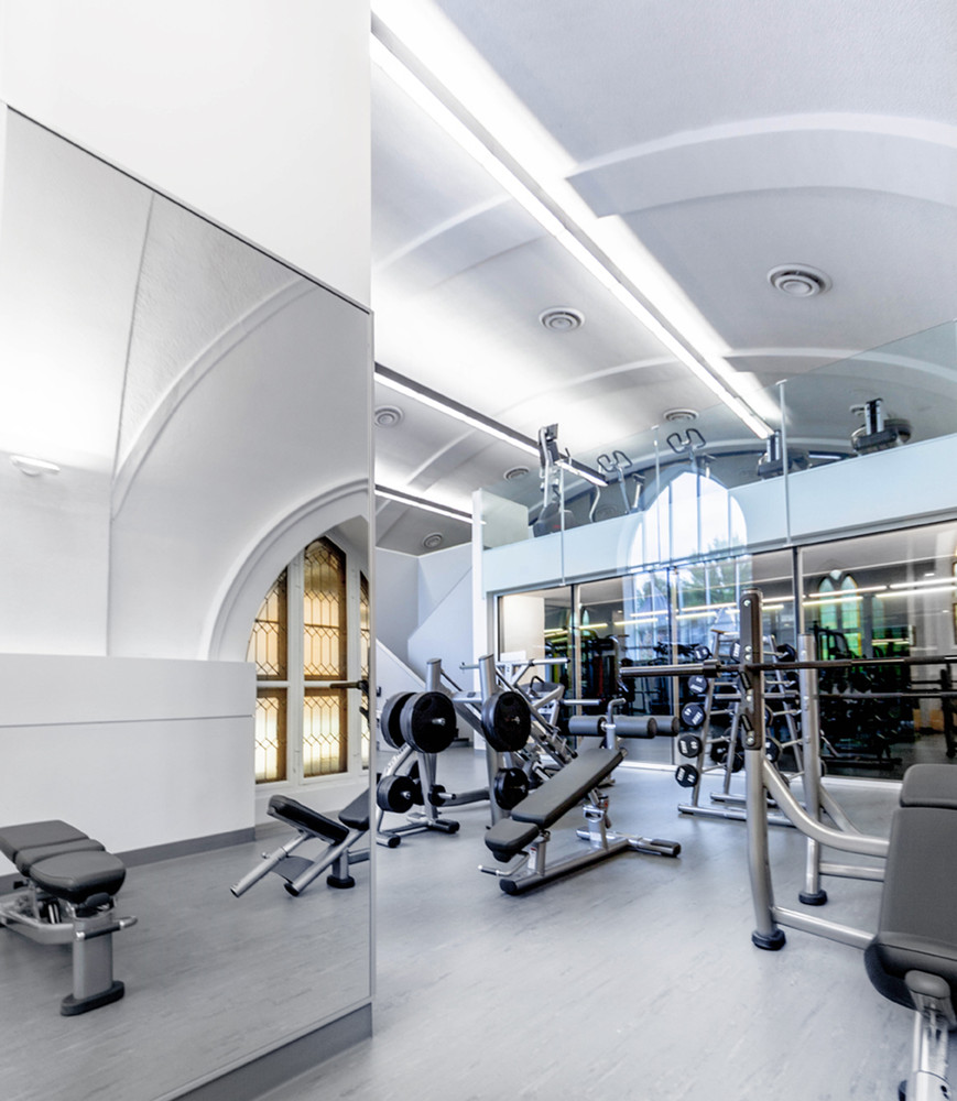 فضای کلیسا به دو سطح تقسیم می شود که مجموعه ای سیال از تجربیات آیینی مکمل یا حلقه های مربوط به سالن بدنسازی و تجربه حرارتی آبگرم را تنظیم می کند. این دو حلقه در سالن استراحت واقع در مرکز ساختمان متقابل هستند. پله ها، راهروها و فضاهای مشترک از سالن بیرون می آیند و به سمت پنجره های موجود و جزئیات معماری کلیسا می روند. دیوارها از طریق استفاده از پارتیشن های شیشه ای که این فضاها را به هم مرتبط می کنند حل می شوند و به نور و نماها اجازه نفوذ به فضاهای مجاور را می دهند. این پیکربندی یک کلاژ تئاتری را ارائه می کند که عناصر و فعالیت های معماری در فضاهای مختلف را به هم گره می زند. این برخوردهای سرسام آور را تسهیل می کند و تعامل انسانی را کاتالیز می کند.