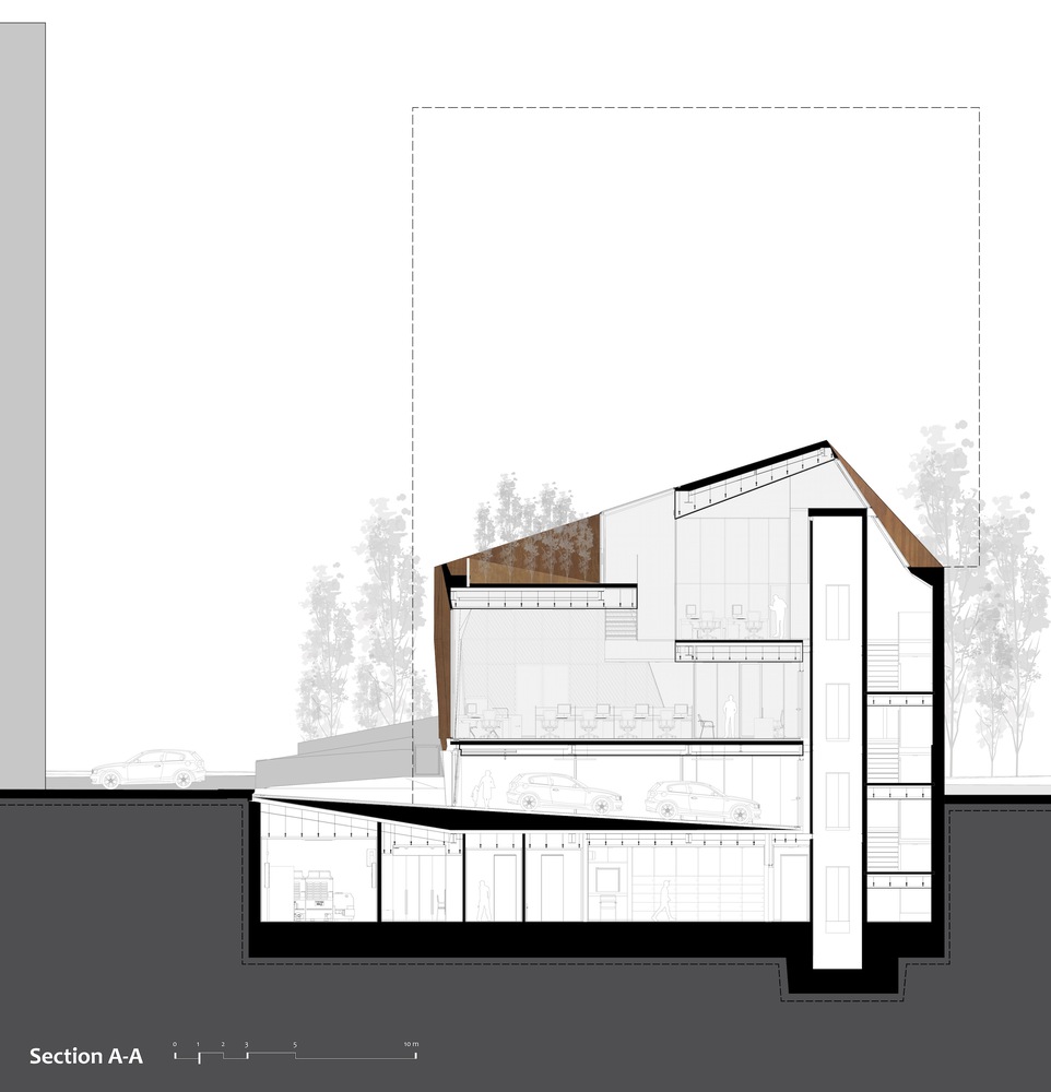 نتیجه پروژه ای است که به لحاظ مکانی، رسمی و مادی در مرز یک بانک و یک ساختمان مسکونی قرار دارد. پروژه کارآفرین به عنوان یک شی عمل می کند که ضمن جدا شدن از محیط اطراف خود به وسیله مقیاس و فرم، هر چه بیشتر به ویلای قدیمی نزدیک می شود. احتمالاً حاضر است به چیزی تبدیل شود بین صندوقچه فلزی گرانبها که آرام آرام با غبار زمان پوشانده شده و یک ویلا.