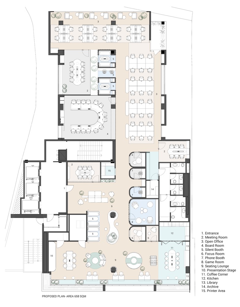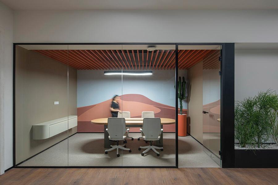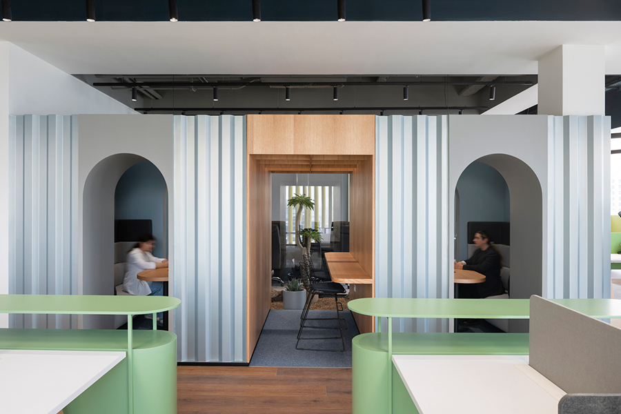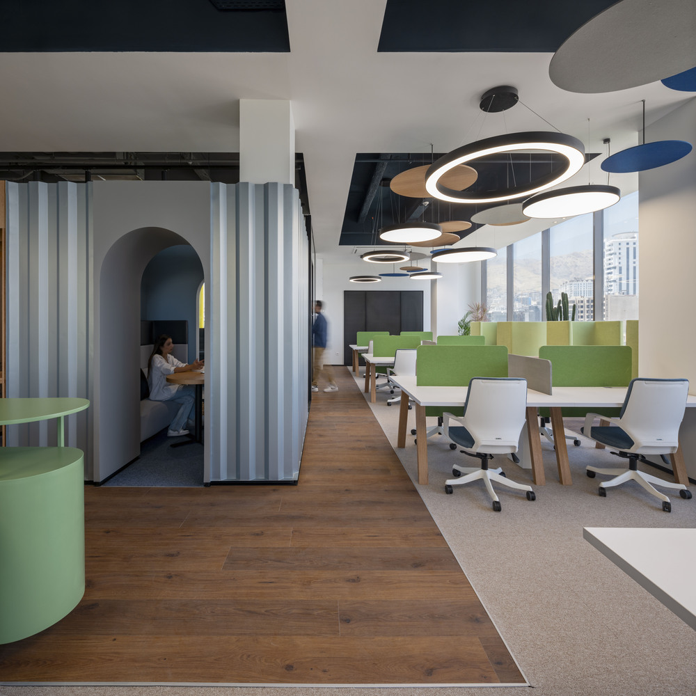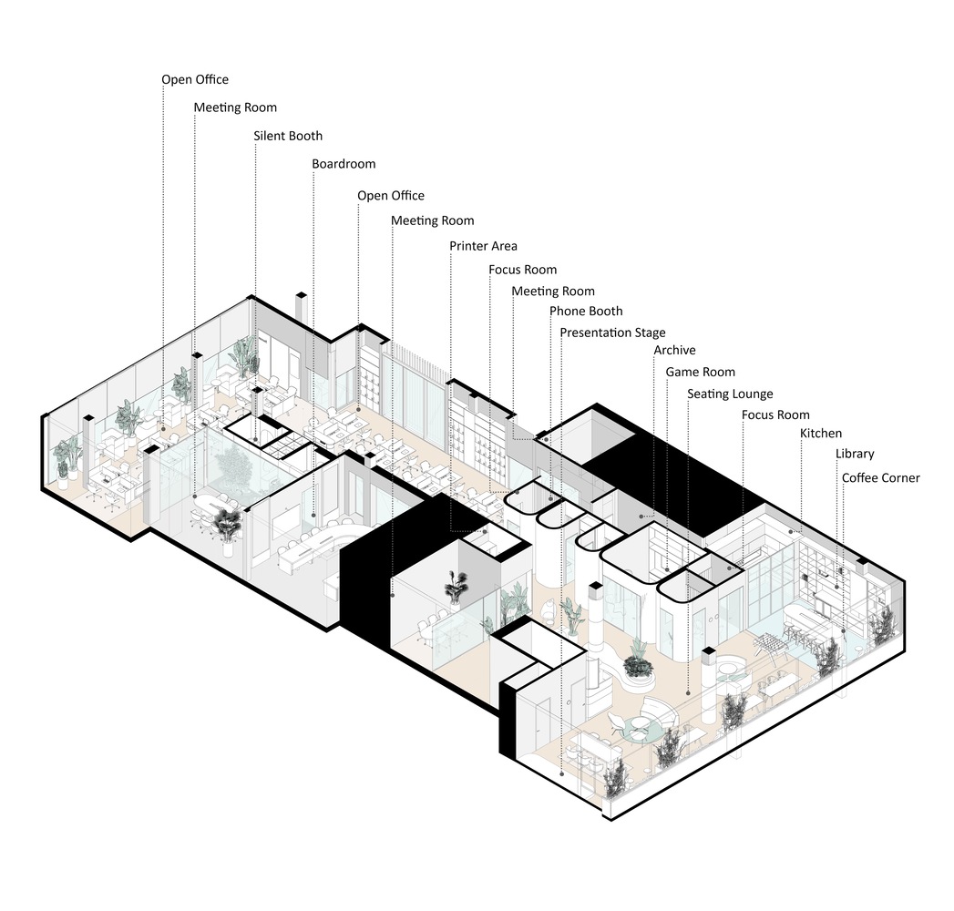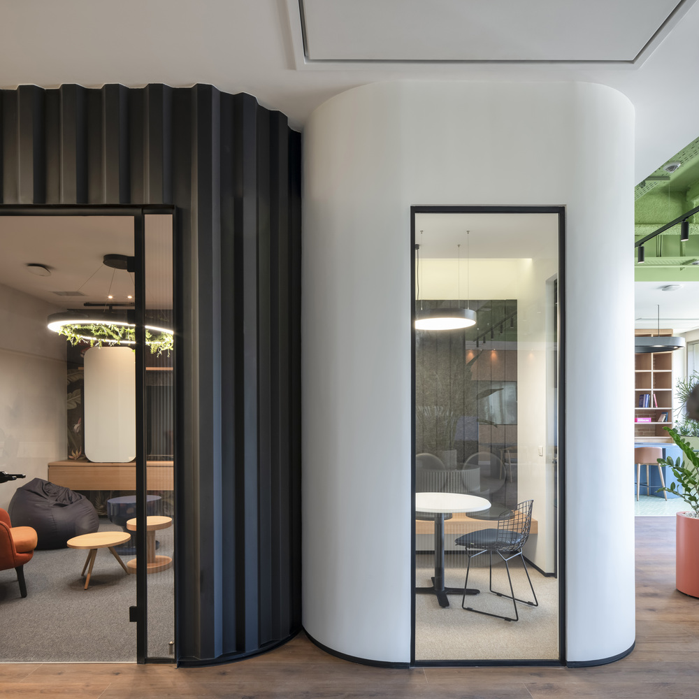 کمبود فضاهای خصوصی در دفاتر باز برای تمرکز یا همکاری و اهمیت فراهم کردن مناطق خصوصی به عنوان فضاهای آرام و راحت برای کارمندان جهت تمرکز و ارتباط موثر، منجر به طراحی غرفههای پیشساخته به عنوان یک راه حل مقرون به صرفه و سازگار شد که به راحتی قابل تحویل و نصب در محل است. در فرآیند طراحی این غرفههای خصوصی که میتوانند به عنوان اتاقهای زوم، غرفههای ساکت، غرفههای تلفن و فضاهای کاری گروهی استفاده شوند، از اشکال ارگانیک و لبههای گرد برای ایجاد یک انتقال بصری نرمتر هنگام قرار گرفتن در دفتر استفاده شد.