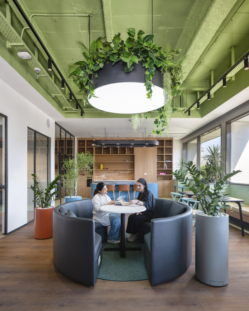 در حالی که برنامهریزی اولیه تعداد مشخصی از ایستگاههای کاری را دیکته میکرد، انعطافپذیری موقعیتهای کاری ترکیبی کارمندان، فرصتی را فراهم کرد تا بیشتر فضای اداری به فضاهای اجتماعی طراحیشده برای شبیهسازی به یک کافیشاپ و فضاهای عمومی اختصاص یابد که انواع مختلفی از صندلیها و موقعیتهای کاری جایگزین را ارائه میدهند. استفاده از چوب بلوط طبیعی و کاشیهای سرامیکی دستساز با رنگهای پر جنب و جوش و فضای سبز، فضایی راحت برای معاشرت و کار ایجاد میکند.