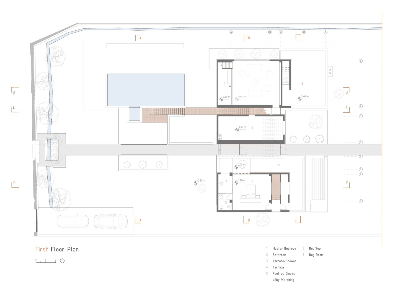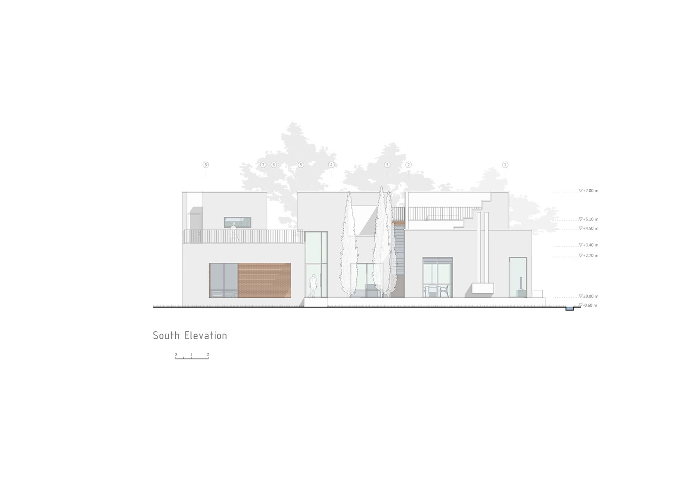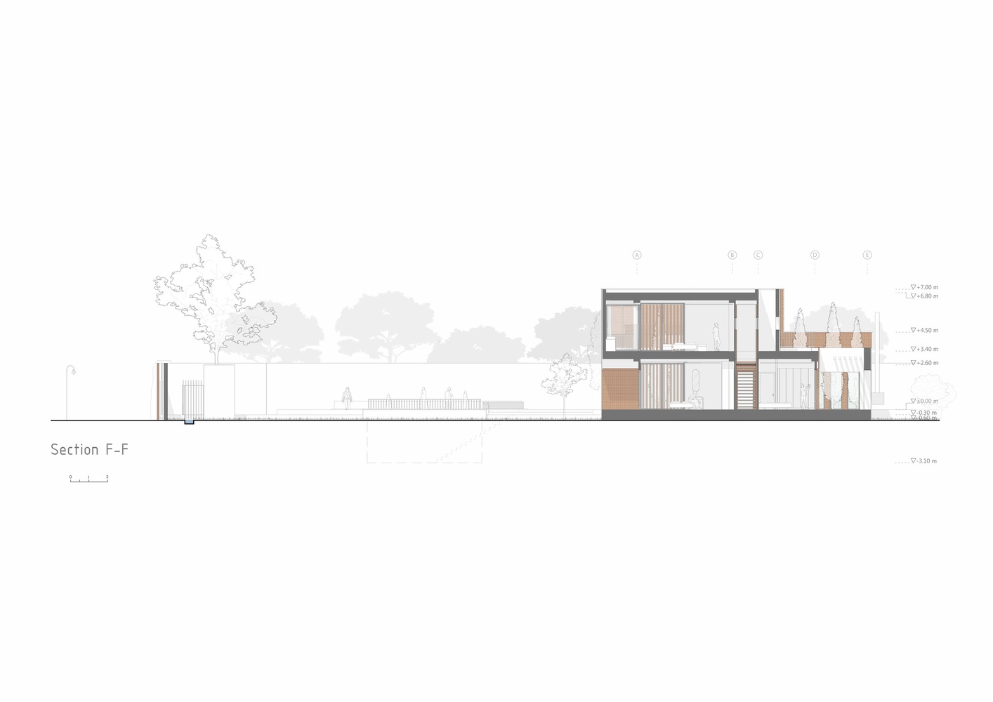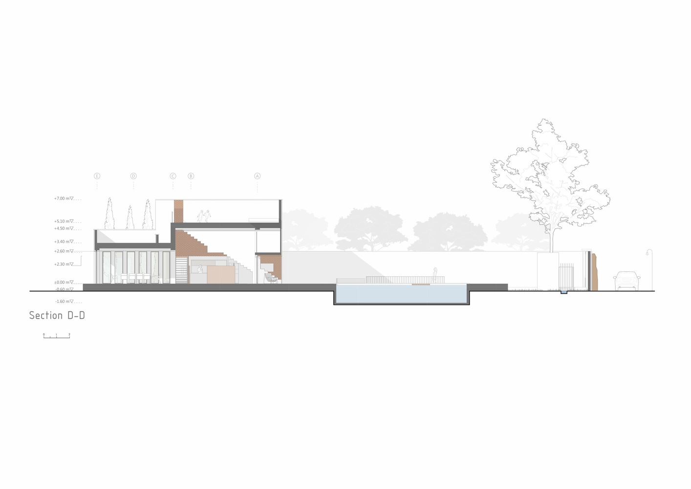 با استفاده از نور خورشید، سایه ها و عناصر معماری، ساختمان در طول روز خود را متفاوت نشان می دهد. پس از داخل شدن، این گزینه را داریم که در خانه بمانیم یا به سمت باغ پشتی ادامه دهیم. از نظر مفهومی، خانه به عنوان یک آلاچیق عمل می کند و از میراث معماری این اقلیم و فرهنگ الهام می گیرد. شکاف دوم نیز ما را به کاوش در سقف ها ترغیب می کند، جایی که می توانیم از سایه ایجاد شده توسط دیوارهای بلند و سقف های چند سطحی لذت ببریم.