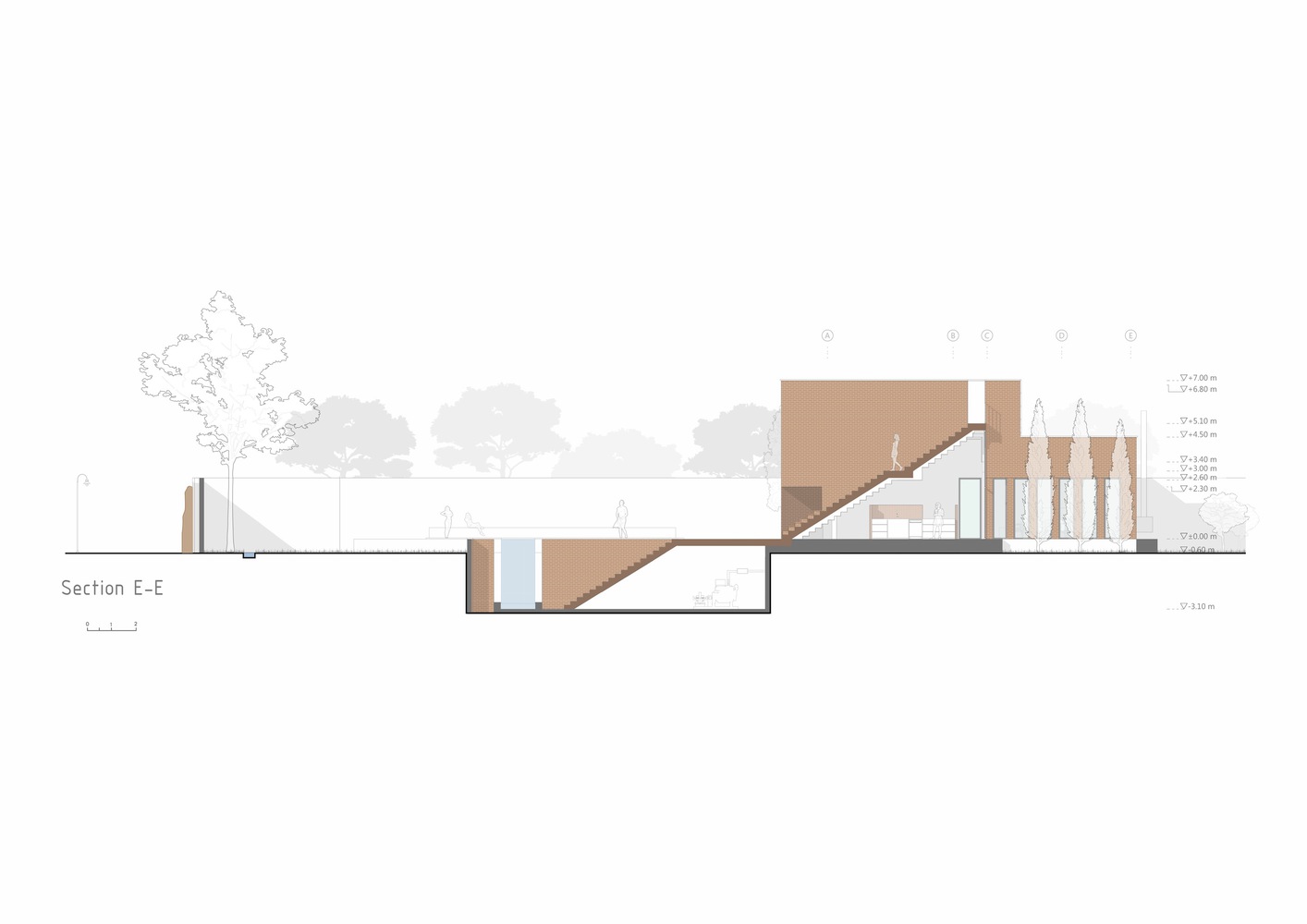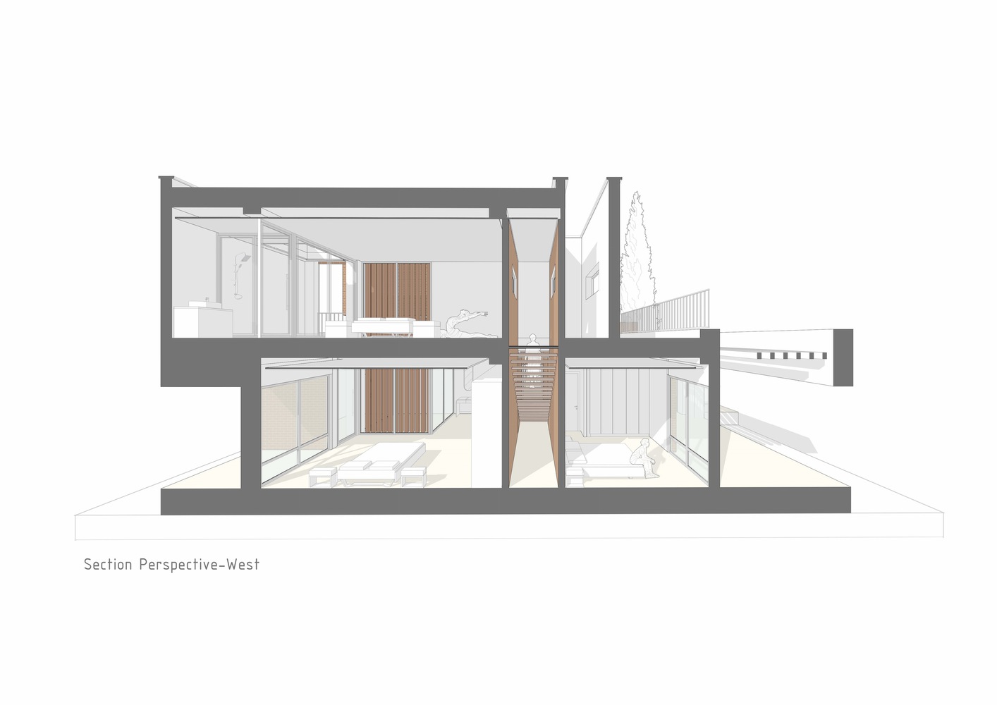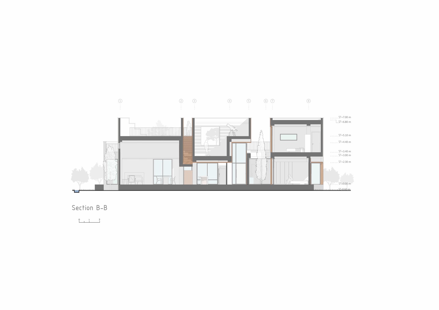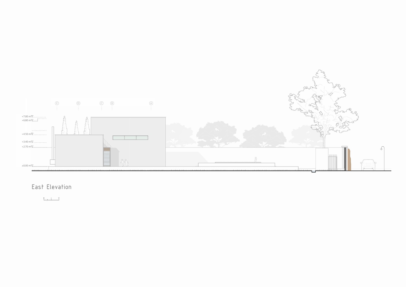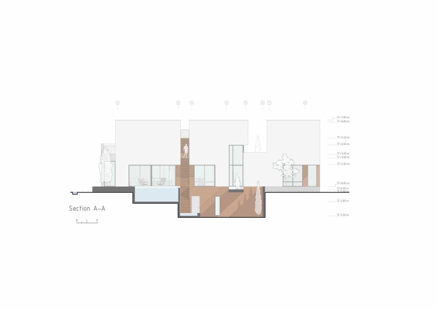 با استفاده از نور خورشید، سایه ها و عناصر معماری، ساختمان در طول روز خود را متفاوت نشان می دهد. پس از داخل شدن، این گزینه را داریم که در خانه بمانیم یا به سمت باغ پشتی ادامه دهیم. از نظر مفهومی، خانه به عنوان یک آلاچیق عمل می کند و از میراث معماری این اقلیم و فرهنگ الهام می گیرد. شکاف دوم نیز ما را به کاوش در سقف ها ترغیب می کند، جایی که می توانیم از سایه ایجاد شده توسط دیوارهای بلند و سقف های چند سطحی لذت ببریم.