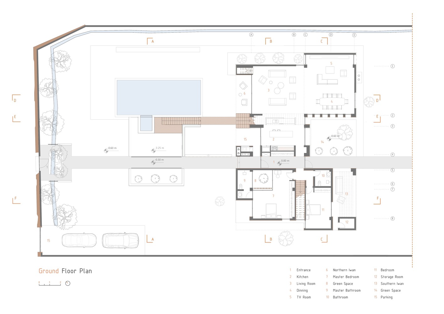 با ایجاد شکاف در دیوار و نصب درب شیشه ای، ورودی باغ را ایجاد کرده اند. این امر باعث شده تا دارایی های باغ از جمله چنارهای کهنسال و مسیر آب از این ملک به زمین کشاورزی با همسایگان و رهگذران تقسیم شود. با ورود به این پروژه، هدف طراح این بوده که حیاط را به خانه وصل کند. طراحان از طریق یک حیاط غرق شده که سایه ای خنک در روزهای گرم و طولانی ایجاد می کند، به این امر دست یافته اند. در این محیط با ساختمانی مواجه می شویم که بخشی از آسمان را به تصویر می کشد، به لطف دو شکاف عمیق که از آن به عنوان «شکاف های آسمان» یاد می کنیم که در مسیر گردش هوا و باد هستند که می توانند به تهویه هوای داخلی کمک کنند.