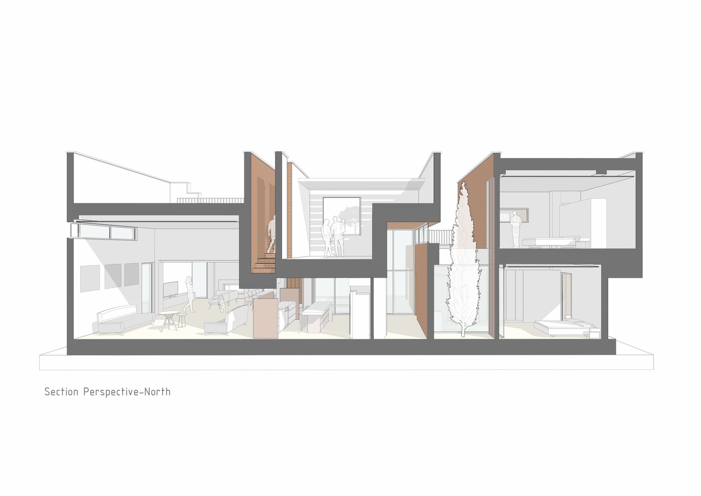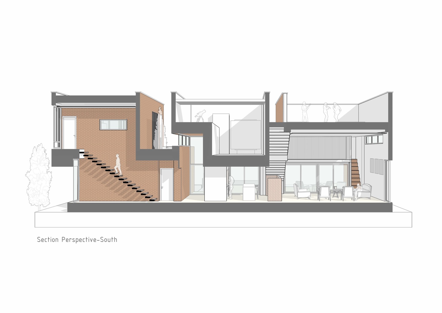 در اصل، فضاهای خانه بین این شکاف ها و هسته ای متراکم از آجرهای ترک خورده توزیع و در هم تنیده شده اند که هدف آن روایت داستانی از احساسات و تجربیات متنوع از درون است.