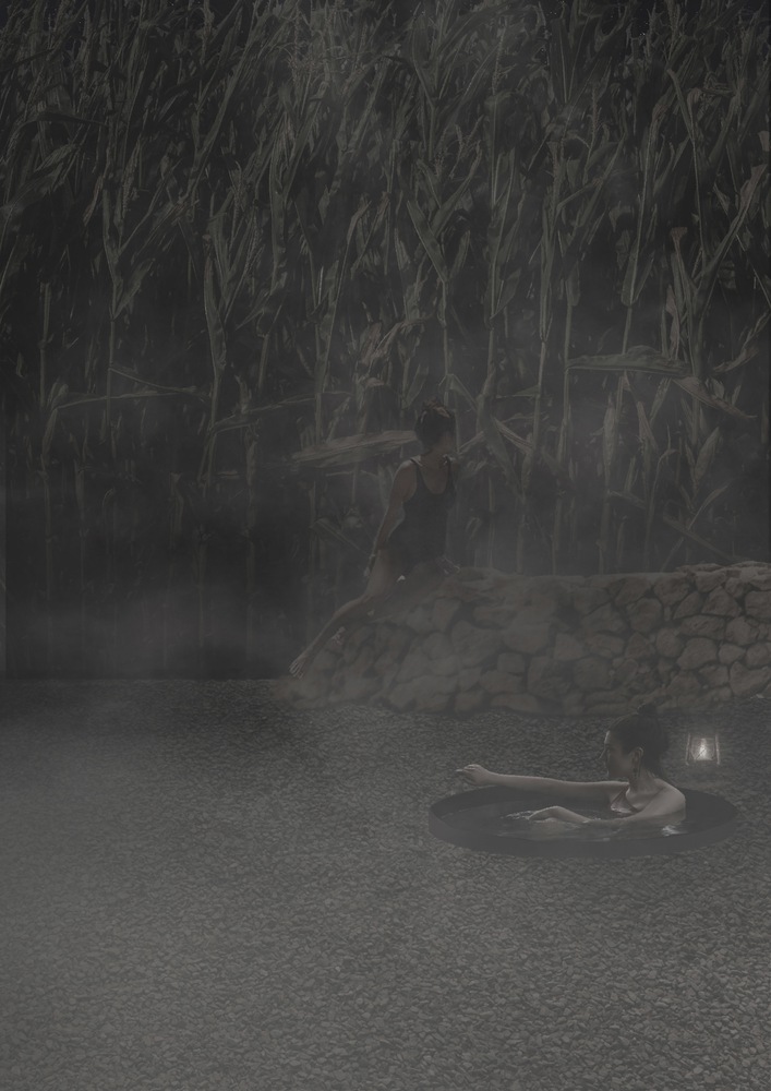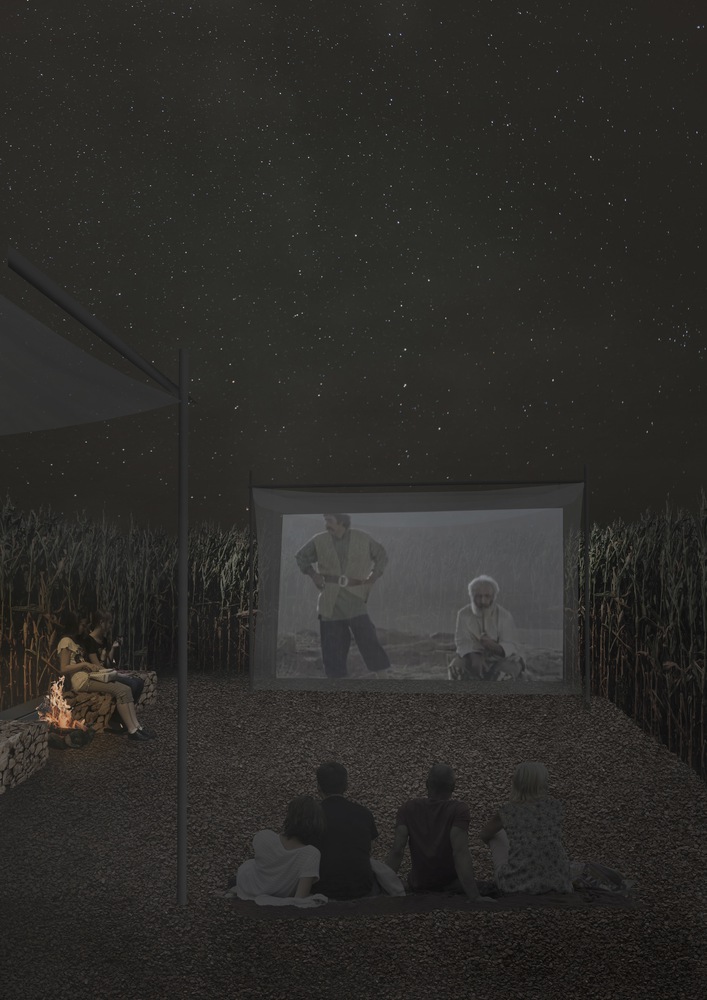 پس از ورود به پیچ و خم تغییر شکل یافته، وارد یک منطقه تجمع می شوید که یک اتاق ابتدایی برای یک سکوی رویداد و یک مکان گرم برای تماشای فیلم یا نشستن در اطراف آتش فراهم می کند. دنیایی از تجربیات ناشناخته در اطراف وجود دارد. به دور از جمعیت، در لبه مخالف پیچ و خم، جایی که مردم برای یافتن گوشه های خود از آنجا دور شده اند، مکان های منحصربه فردی برای حمام کردن، استراحت یا خوابیدن وجود دارد. طراح برج دید را در لبه دیگر مزرعه با منظره ای پانوراما بر روی عرشه چوبی برپا کرده است، جایی که آرامش بی نظیر طبیعت را مشاهده می کنید در حالی که نسیم به آرامی بر مزرعه موج می زند.