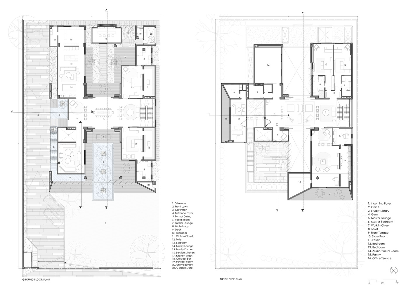 خانه به سه بلوک یکپارچه تقسیم شده است که در یک محور مجزا قرار گرفته اند که با زنجیره ای سیال از فضاها و سکوت های صمیمی که با خلأهایی که زمان را در حالت تعلیق نگه می دارند، به هم متصل شده اند. بیان مادی با ساختار منسجم منطقی همخوانی دارد، تأثیرات طراحی غربی را با فناوری های بومی متحد می کند و اصول ودایی را به دست می آورد، تجربه ای جذاب که با ادغام پنج عنصر طبیعت ایجاد می شود و تمام حواس انسان را برمی انگیزد.