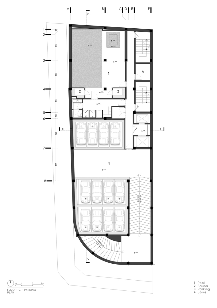 طبقه اول ساختمان شامل یک لابی و یک سالن اجتماعات است، در حالی که طبقه دوم میزبان یک سالن ورزشی است. ۹ طبقه بعدی هر کدام یک واحد مسکونی را در خود جای می دهند. سطوح زیرزمین امکانات پارکینگ و استخر شنا را برای ساکنین فراهم می کند.