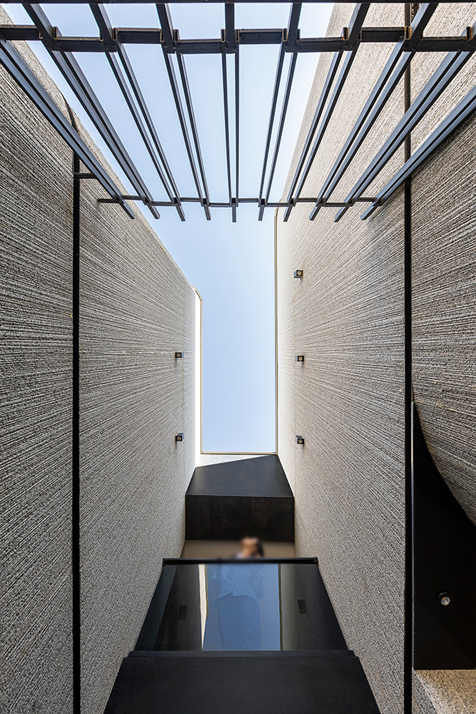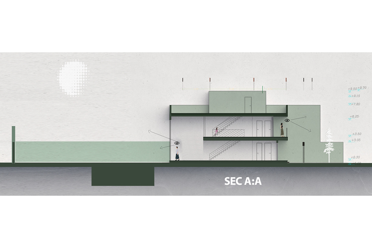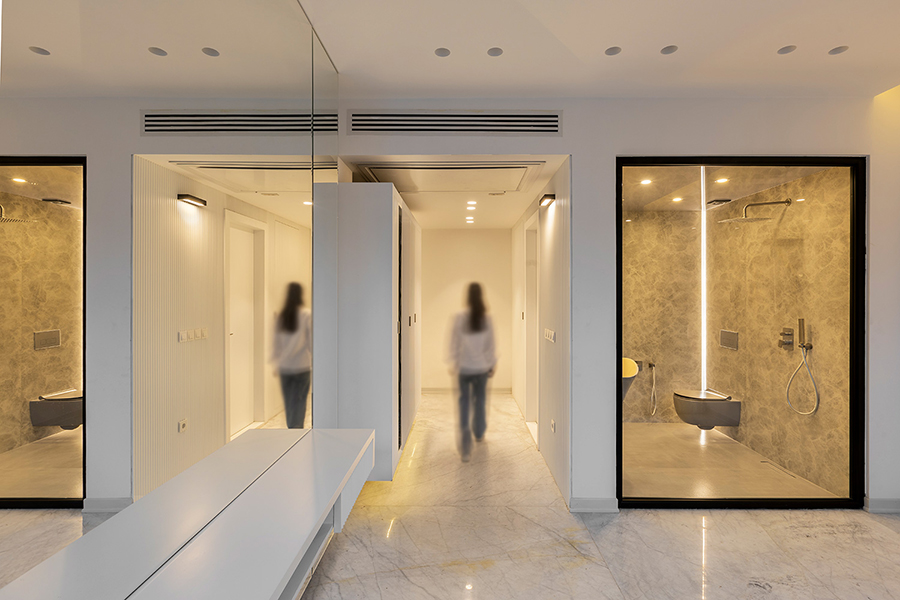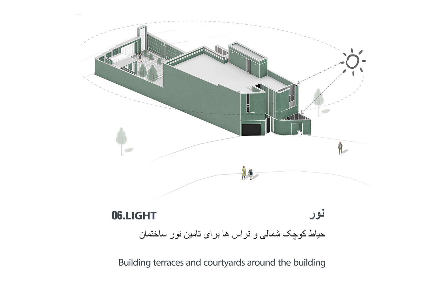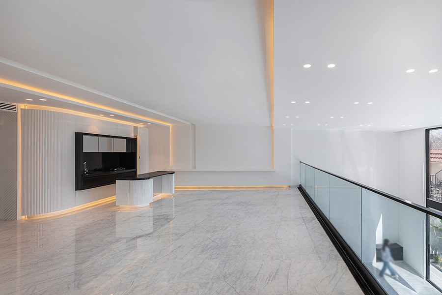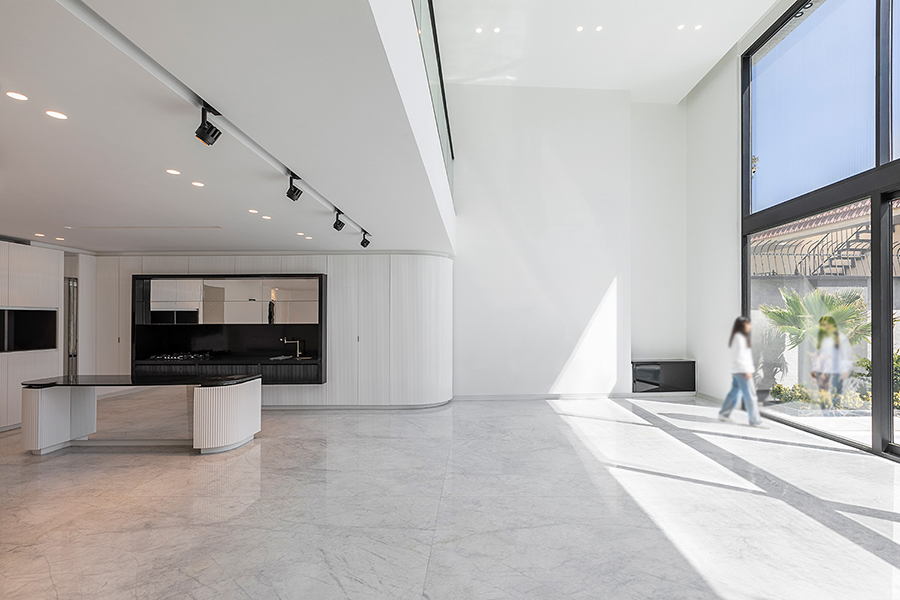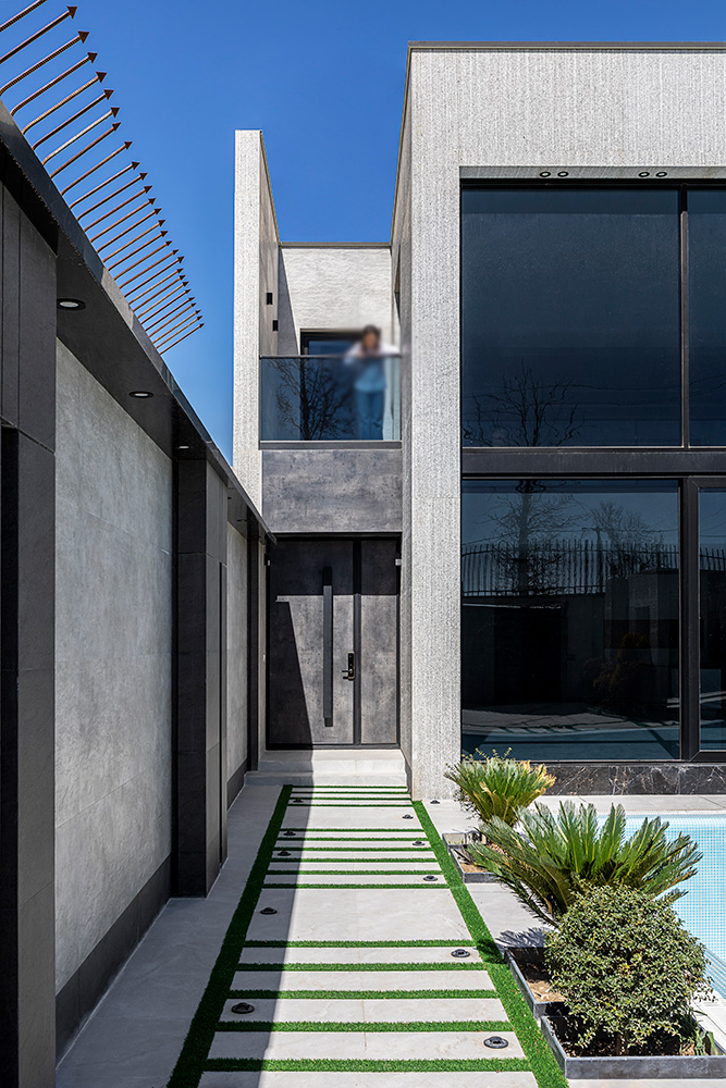اولین دغدغه برای تیم طراحی ایجاد ساختی منظم در هندسه ی بینظم زمین بود. بنابراین بر آن آمدیم تا فضاهای خصوصی و کوچک تر را در سمت شمال و ضلع کج زمین و فضاهای عمومی تر را در ضلع جنوب و هم جوار با حیاط ویلا در نظر بگیریم. از این رو یک اتاق و پارکینگ، آشپزخانه و سالن اصلی ویلا در طبقه ی همکف و دو اتاق خواب و نشیمن ویلا در طبقه ی اول قرار گرفت. با توجه به مشرفیت ضلع شمالی، برای تامین نور اتاق ها، حیاطی کوچک در طبقه ی همکف در نظر گرفتیم. همچنین برای اتاق های طبقه ی اول، شکاف هایی در نمای شمالی ایجاد کردیم تا ورود نور به صورت مستقیم و از طریق تراس فراهم شود. از آنجاییکه ورودی اصلی ویلا از ضلع شمال بود، با ایجاد فرورفتگی در نمای شمالی و قراردادن تراسی کوچک در بالای آن، معنای بیشتری به ورودی ویلا بخشیدیم. با توجه به ابعاد کم ساختمان، تلاش بر آن شد که با قرار دادن وید در بالای سالن و استفاده از رنگ های روشن و آینه در طراحی داخلی حس فضایی بزرگتر را القا کنیم.