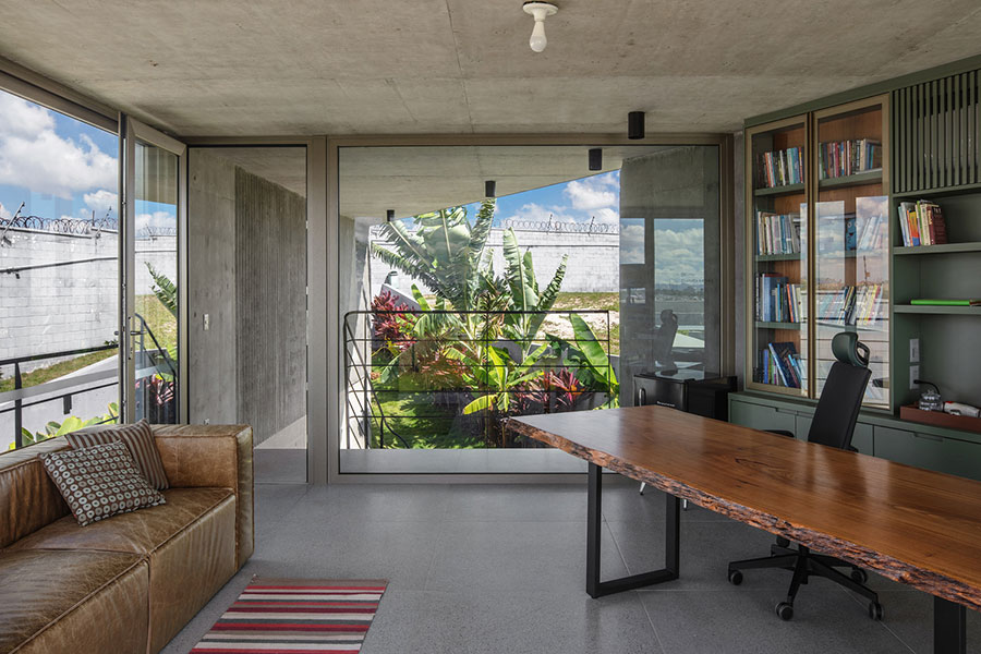 مصالح بهکاررفته، نقش اساسی در انتقال این حس دارند. بتن اکسپوز، بهعنوان متریال غالب، نه تنها بیانگر صداقت سازهای است، بلکه نوعی خامی کنترلشده را به نمایش میگذارد. سطح بتن بدون تزئینات اضافی، اجازه میدهد نور، سایه و گذر زمان خود بهعنوان عناصر طراحی عمل کنند. در کنار بتن، شیشه با شفافیت بالا قرار گرفته است؛ عنصری که مرز میان درون و بیرون را تا حد امکان محو میکند و فضاهای داخلی را به چشمانداز سبز اطراف پیوند میزند.