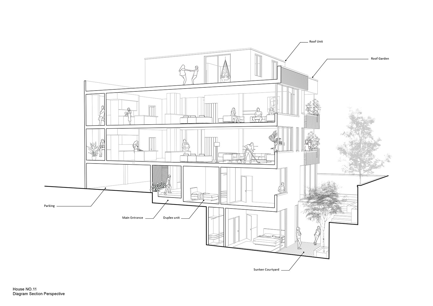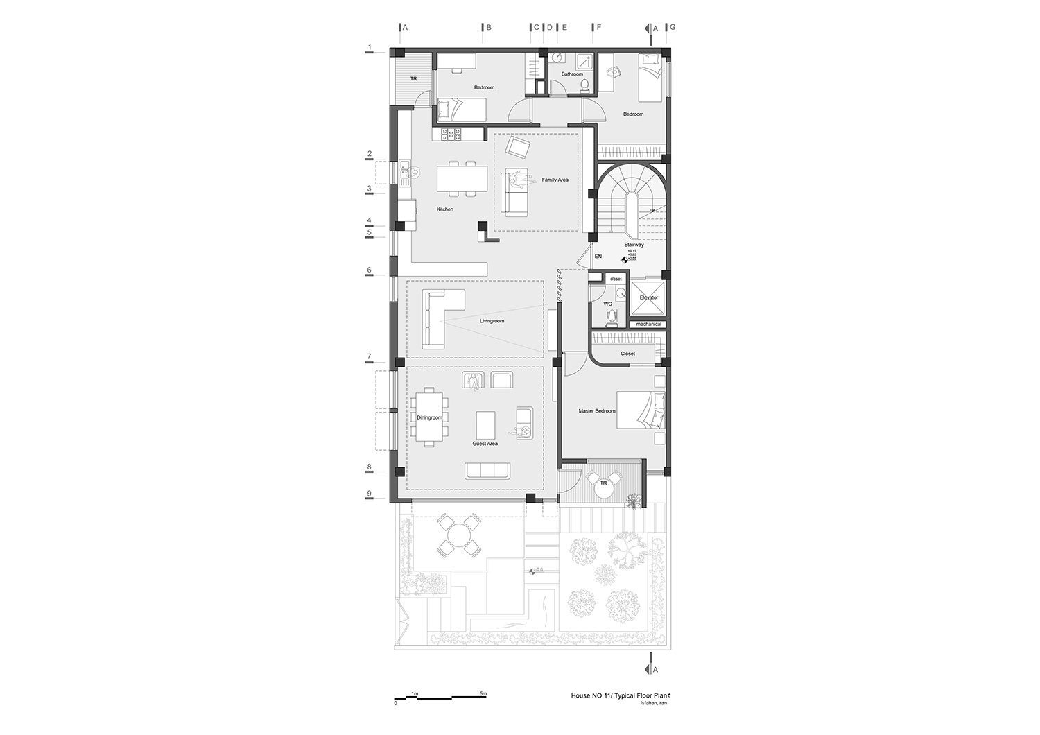 کارفرما ی این پروژه یک خانواده چهار نفره (یک زوج همراه با دو فرزند) بود که به یک واحد جهت زندگی فعلی خانواده و همچنین دو واحد مشابه جهت زندگی فرزندان در آینده نیاز داشت. پدر و مادر خانواده علاقمند به در اختیار داشتن حیاط بودند، در نتیجه طبقه همکف برای زندگی آن ها اختصاص داده شد. از این جهت که قسمت زیادی از طبقه همکف اختصاص به پارکینگ و لابی پیدا می کرد، این طبقه نمی توانست فضای مورد نیاز خانواده فعلی را تامین کند که این موضوع چالشی را برای طرح ایجاد می کرد. بنابر این جهت تامین فضای مورد نیاز یک طبقه زیرزمین ایجاد گردید تا به همراه طبقه همکف یک واحد دوبلکس فراهم آورد.