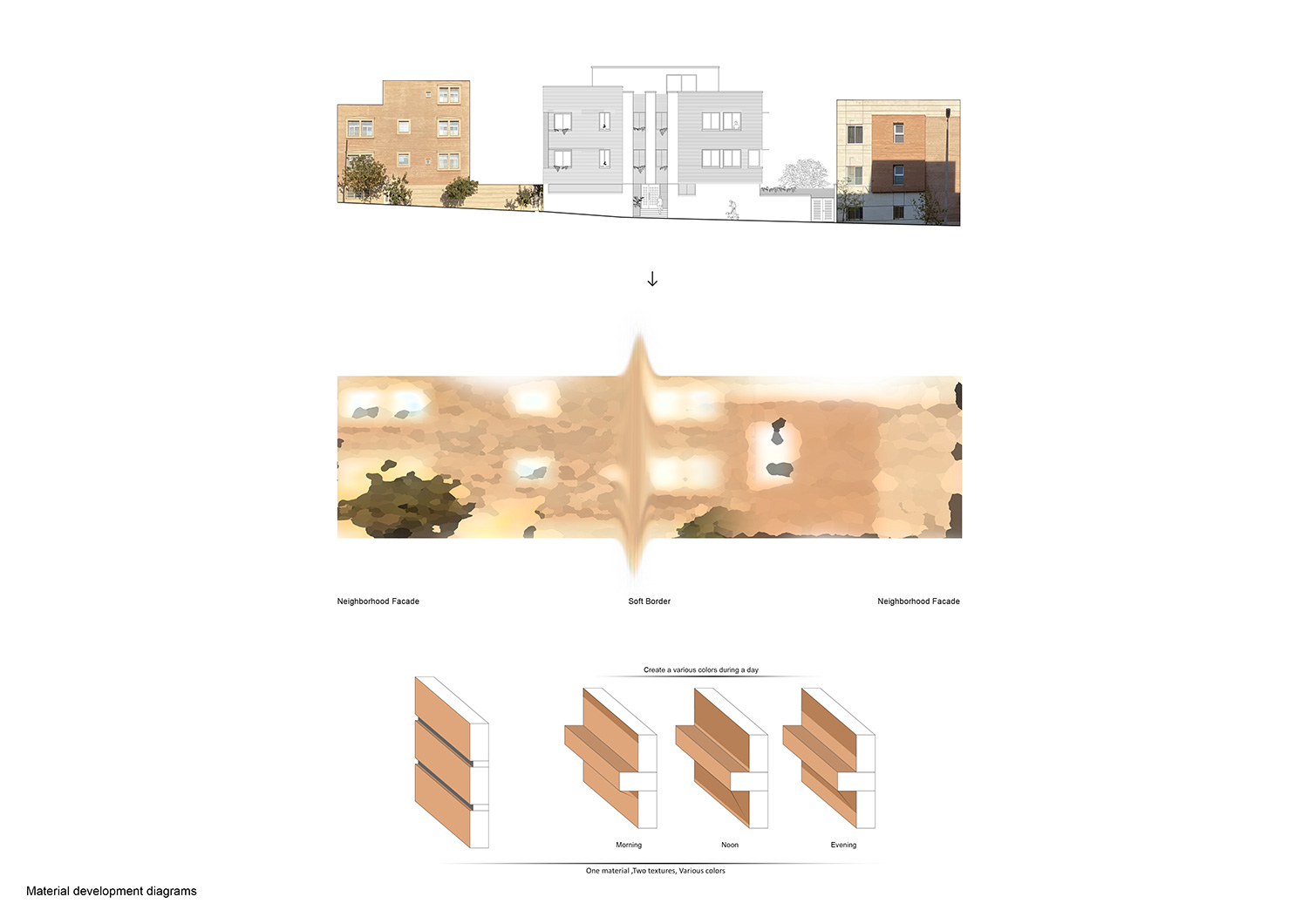 آن ها در انتخاب رنگ آجرها سعی کردند بر اساس آبستره کردن نماها ی مجاور رنگ غالب را پیدا کنند تا ساختمان همچون حلقه ی اتصال ساختمان های مجاور عمل کند و به تنوع رنگ و متریال نیفزاید.