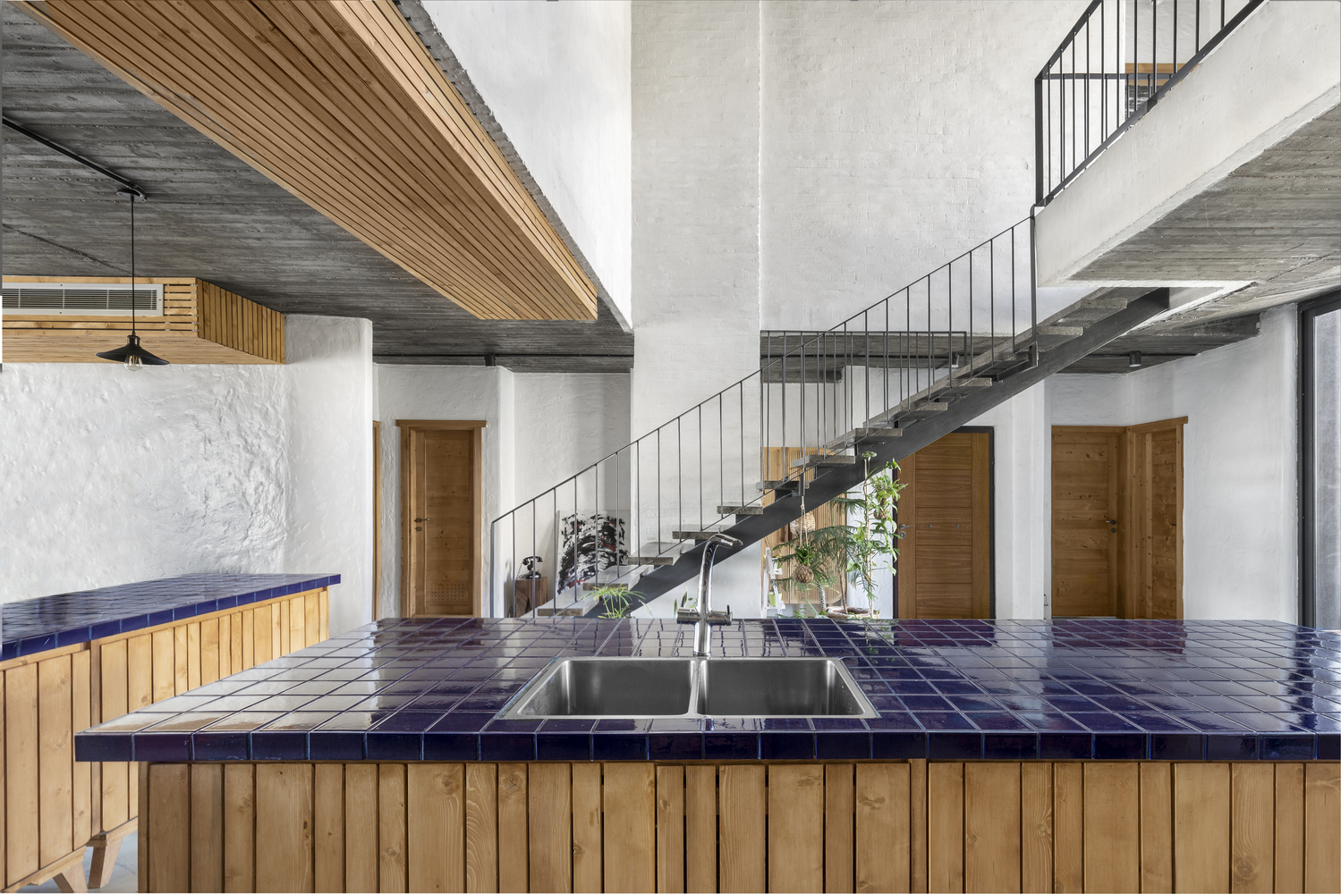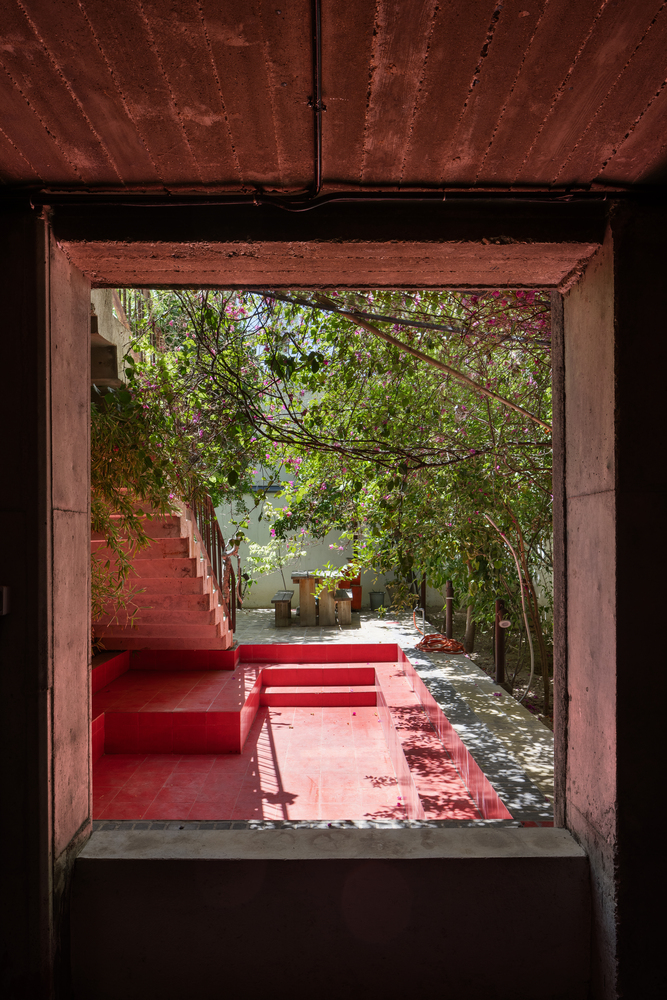 برای مقابله با کشش دوگانه ی چشم انداز شمالی و نور جنوبی، یک واحد دوبلکس در طبقه اول قرار داده شد که به زوج اجازه می دهد در هر دو جهت زندگی کنند. دو فضای نشیمن مجزا و چهار اتاق در دو طبقه گسترده شده اند: یک اتاق خواب اصلی آفتاب گیر در جنوب، دو اتاق مهمان رو به منظره سرسبز شمالی و یک استودیوی خلوت برای مریم. چیدمان فضایی، حرکت سیال بین فضای عمومی و خصوصی، نور و سایه، باز بودن و محصور بودن را در اولویت قرار می دهد.