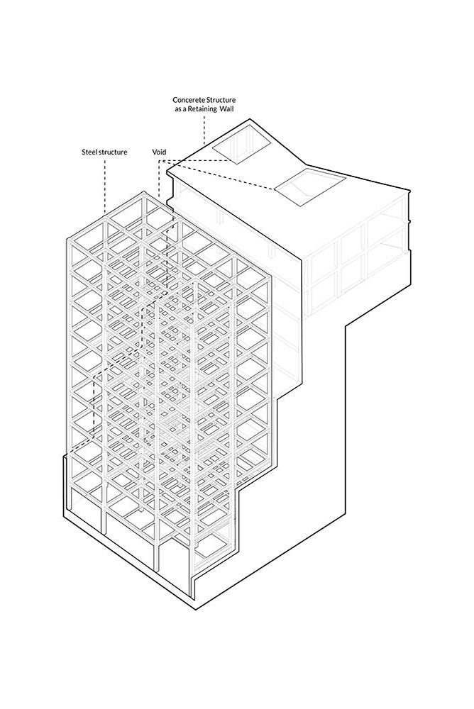 طراحی آپارتمان میگون زمانی به این دفتر محول شد که کارفرمای پروژه عملیات خاکبرداری را انجام داده بود. این خاکبرداری گسترده، مسیر طراحی را از آنچه این سایت در شیب طبیعی زمین می طلبید متفاوت کرده بود. با توجه به گود برداری موجود و ناپایداری آن، اولین اقدام تصمیم جهت چگونگی تثبیت این خاکبرداری بود. زیرا ترانشه گود در اثر مجاورت با هوا دچار هوازدگی شده و فرو می ریخت. از سوی دیگر این عملیات خاکبرداری سبب شده بود که ساختمان آینده تنها از ضلع جنوب امکان نورگیری داشته باشد و استفاده از نورگیر در محدوده شمالی زمین را اجتناب ناپذیر کرده بود. ایده طراحی بر این اساس شکل گرفت که نور گیر در محدوده مرکزی ساختمان می تواند امکان تهویه و تامین نور طبیعی را در دو ضلع آن فراهم آورد. همچنین این تصمیم به پایداری گود نیز از این جهت کمک می کرد که به جای اجرای یک دیوار حائل با ضخامت بالا، عملا یک شبکه سازه بتنی که در آن شفت دسترسی های عمودی و برخی فضاها قرار می گیرند در نظر گرفته شود.