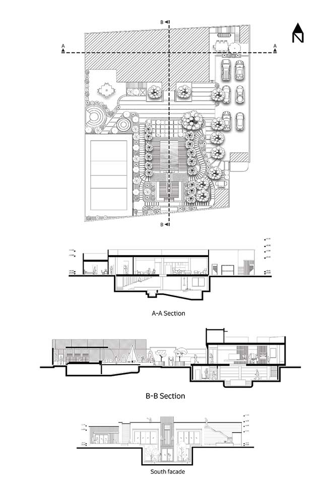 طبقه ی همکف فضای کاملی برای اقامت خانواده به همراه برگزاری مهمانی های بزرگ شد و از طریق یک دسترسی عمودی (پلکان معلق) به زیر زمین متصل گردید، زیرزمین از محوطه هم دسترسی دارد، طبقه ی همکف از دو سمت شرق و جنوب رخ به بیرون دارد و با گشاده دستی بازشوهایی (پنجره) طراحی شد که بتواند نور روز را به تمامی به درون بکشاند و مهمتر از آن ارتباط بصری درون و بیرون را به حداکثر برساند. در طراحی نورپردازی شبانه، علاوه بر اینکه نیازهای فعالیتهای شبانه برطرف می شود، برای بهره بردار، تجربهی منحصر به فردی را ایجاد می کند.
