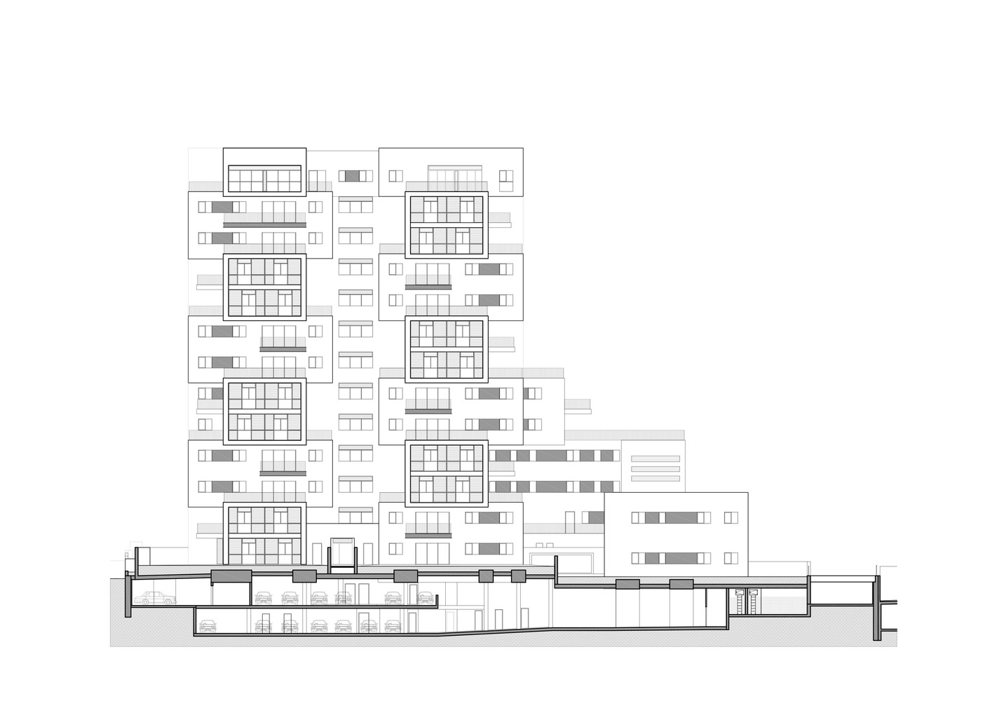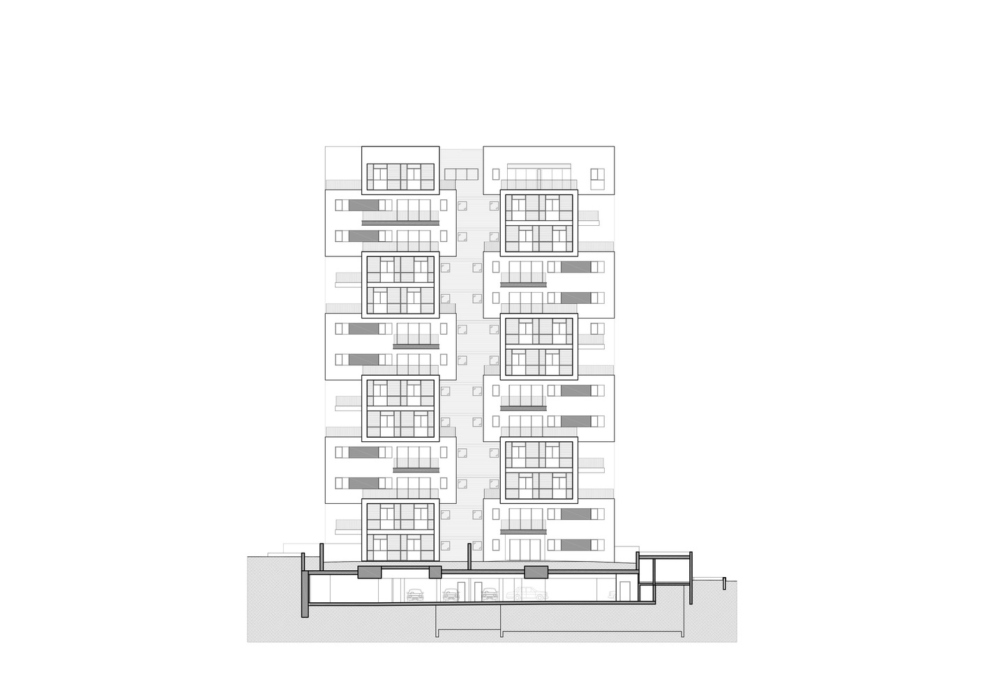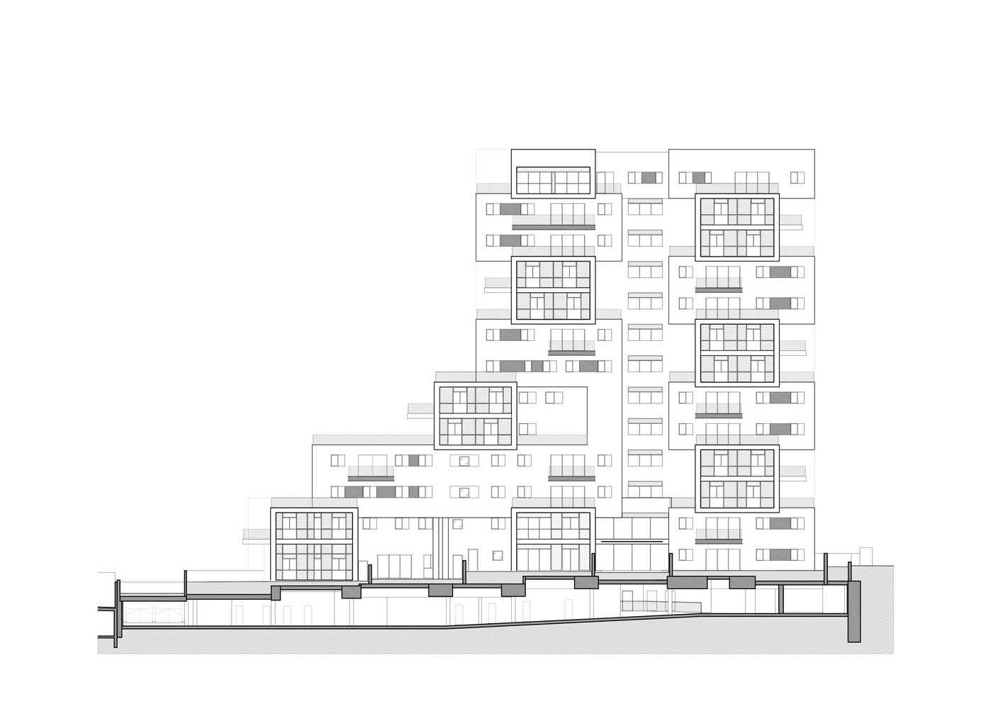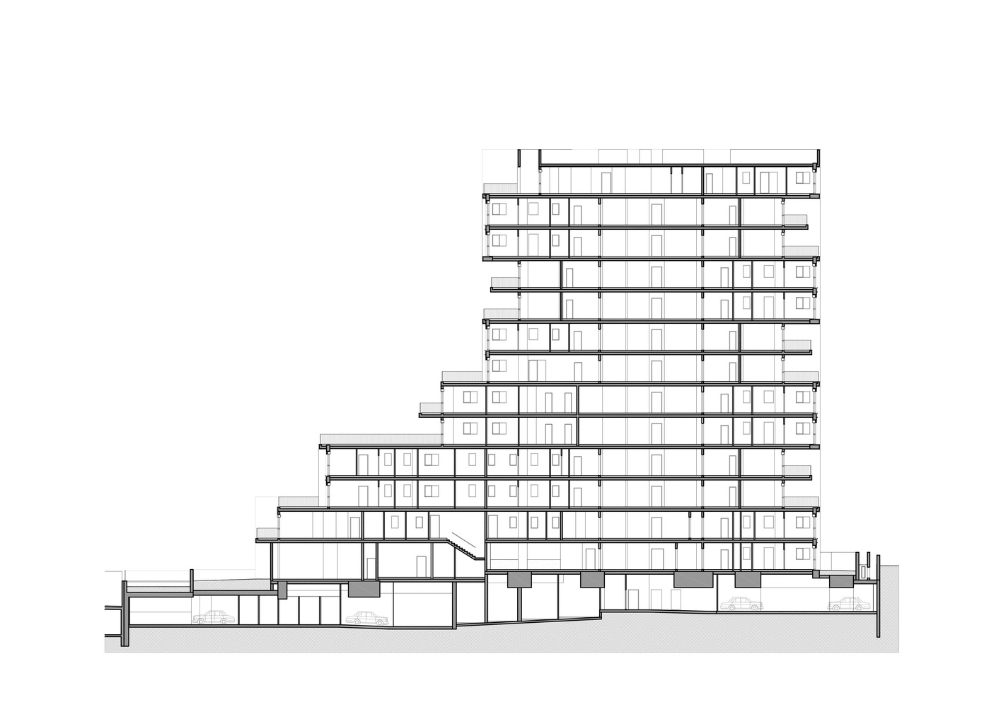 حجم ساخت و ساز بزرگتر از مجموع حقوق ساختمان تعیین شده است، و این فرصت را به طراحان داده است که با انبوه سازی کنند و آن را دوباره مجسمه سازی کنند، زیرا محدود به محدودیت های ساخت و ساز معمولی برای زمین های شهری نبوده اند. بنابراین آن ها این فرصت را داشته اند که ۱۷ نوع آپارتمان مختلف (در مجموع ۵۶ واحد) طراحی کنند که هر کدام یک تراس بزرگ را ارائه می دهند، به اندازه ای که تنها آپارتمان های باغ و پنت هاوس تا به امروز از آن برخوردار بوده اند. علاوه بر این، آپارتمان مستقل و دوبلکس منحصر به فرد را برنامه ریزی کنیم.