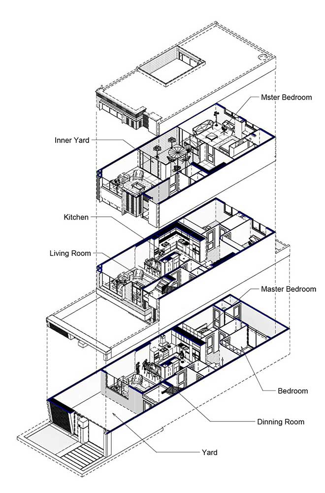 در طراحی طبقات باید نظر فرزندان جوان خانواده جلب می‌ شده است. تفکیک فضای نشیمن، پذیرایی و قرار گرفتن آشپزخانه در قلب فضا با ایجاد حریم در فیلتر ورودی ساختمان لحاظ شده است.